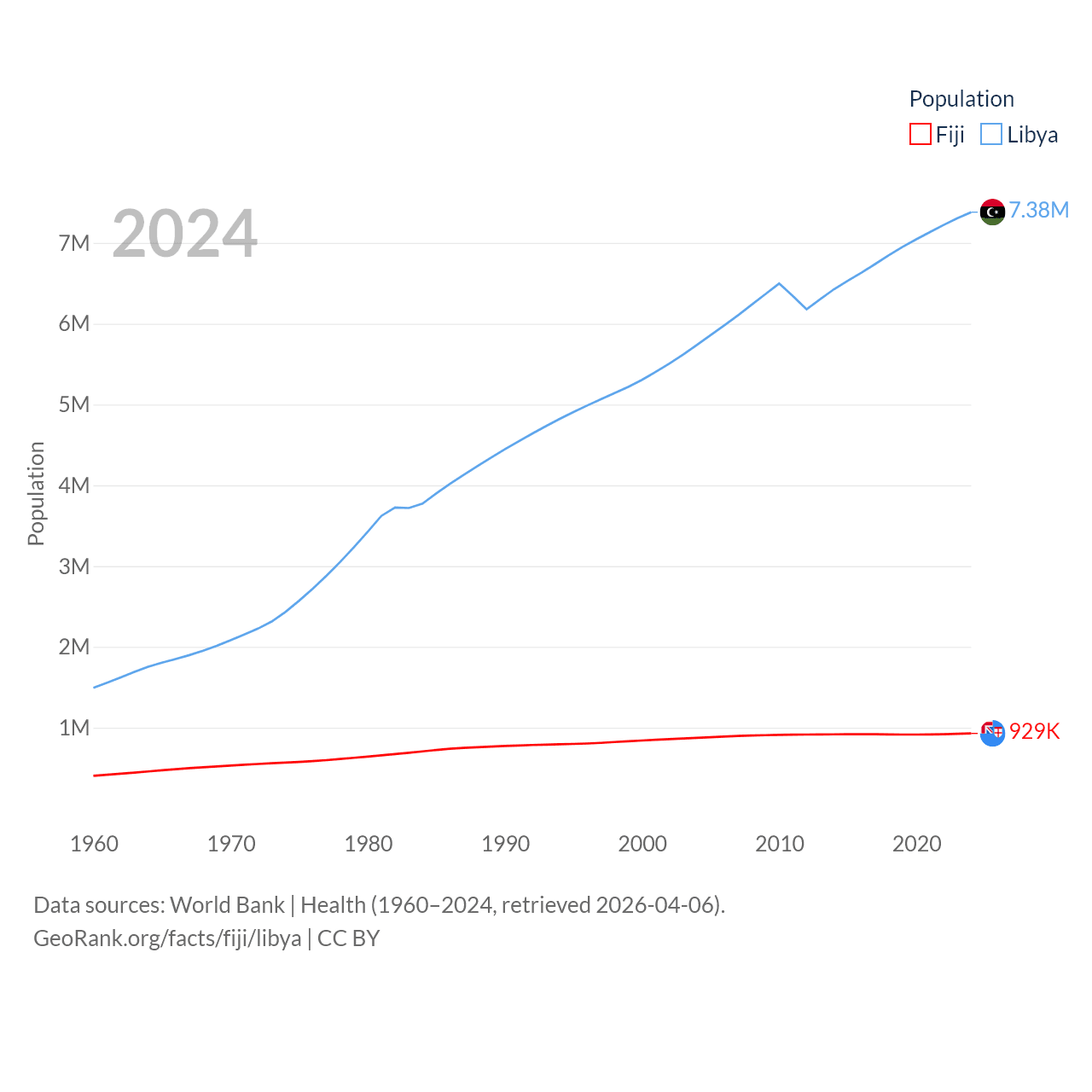 Fiji has a population of 929K (ranked 159/197), compared with 7.38M in Libya (ranked 105/197). Fiji's land area is 7,054 sq mi versus 679,362 sq mi for Libya (ranked 152nd vs. 16th).