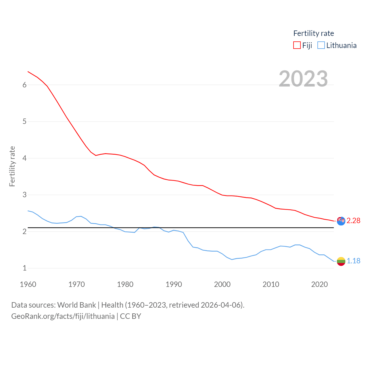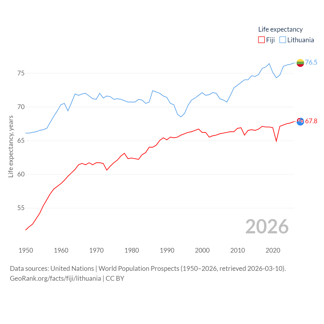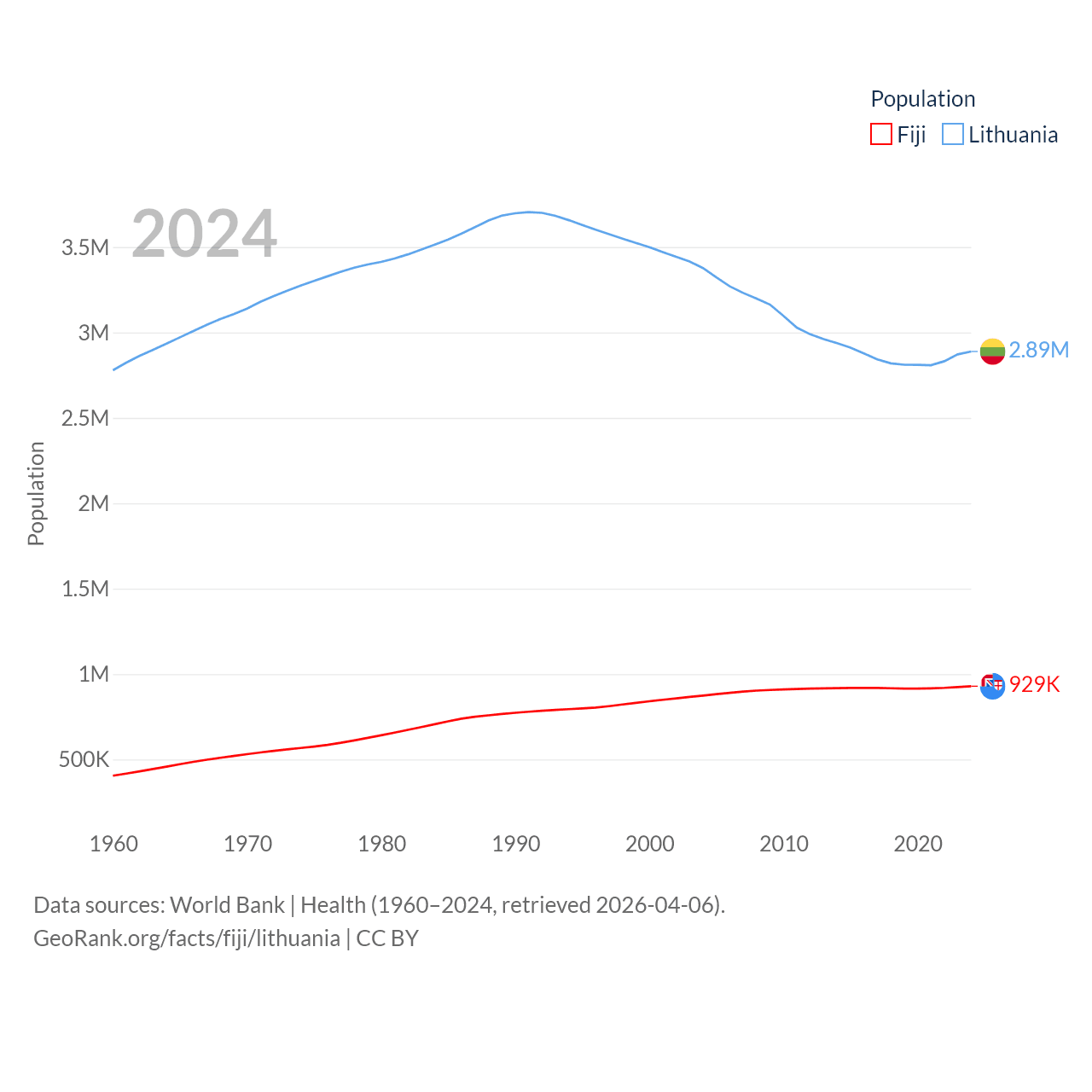Fiji has a population of 929K (ranked 159/197), compared with 2.89M in Lithuania (ranked 137/197). Fiji's land area is 7,054 sq mi versus 24,170 sq mi for Lithuania (ranked 152nd vs. 120th).
