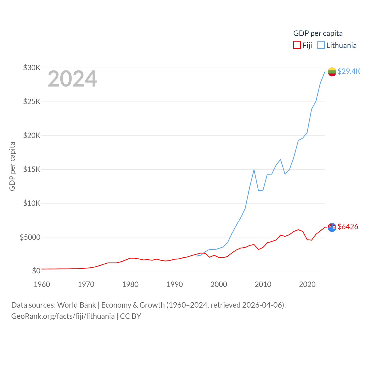 By GDP, Fiji ranks 161/197 ($5.97B) and Lithuania ranks 79/197 ($84.9B). By GDP per capita, Fiji ranks 108/197 ($6,426), while Lithuania ranks 43/197 ($29,384).