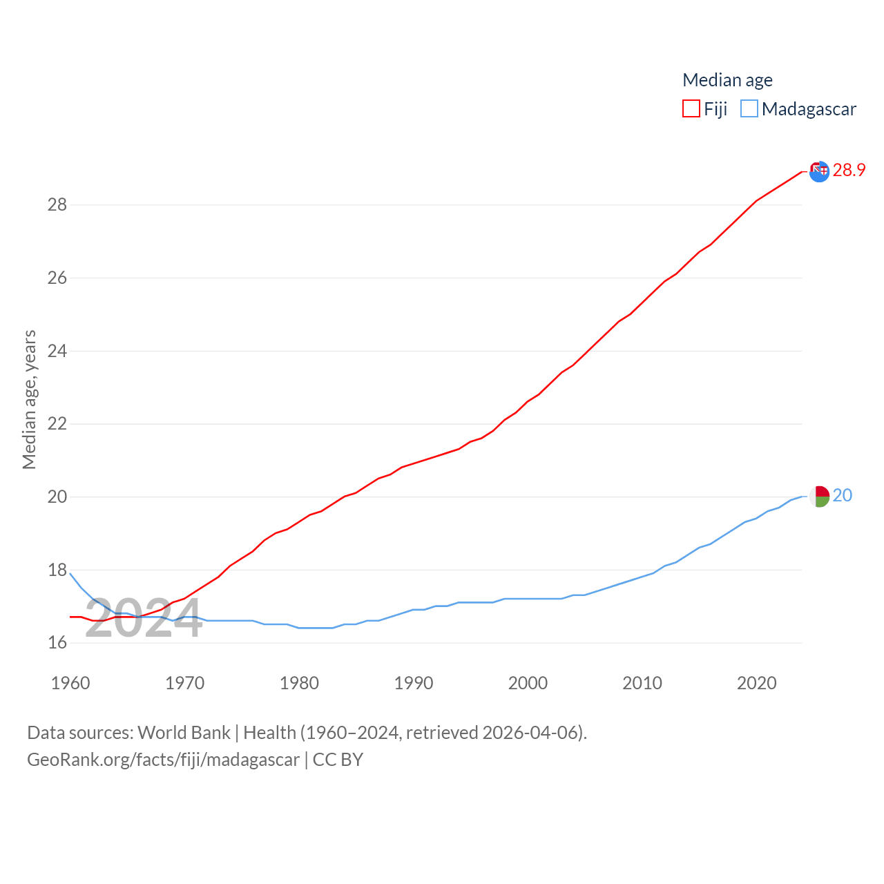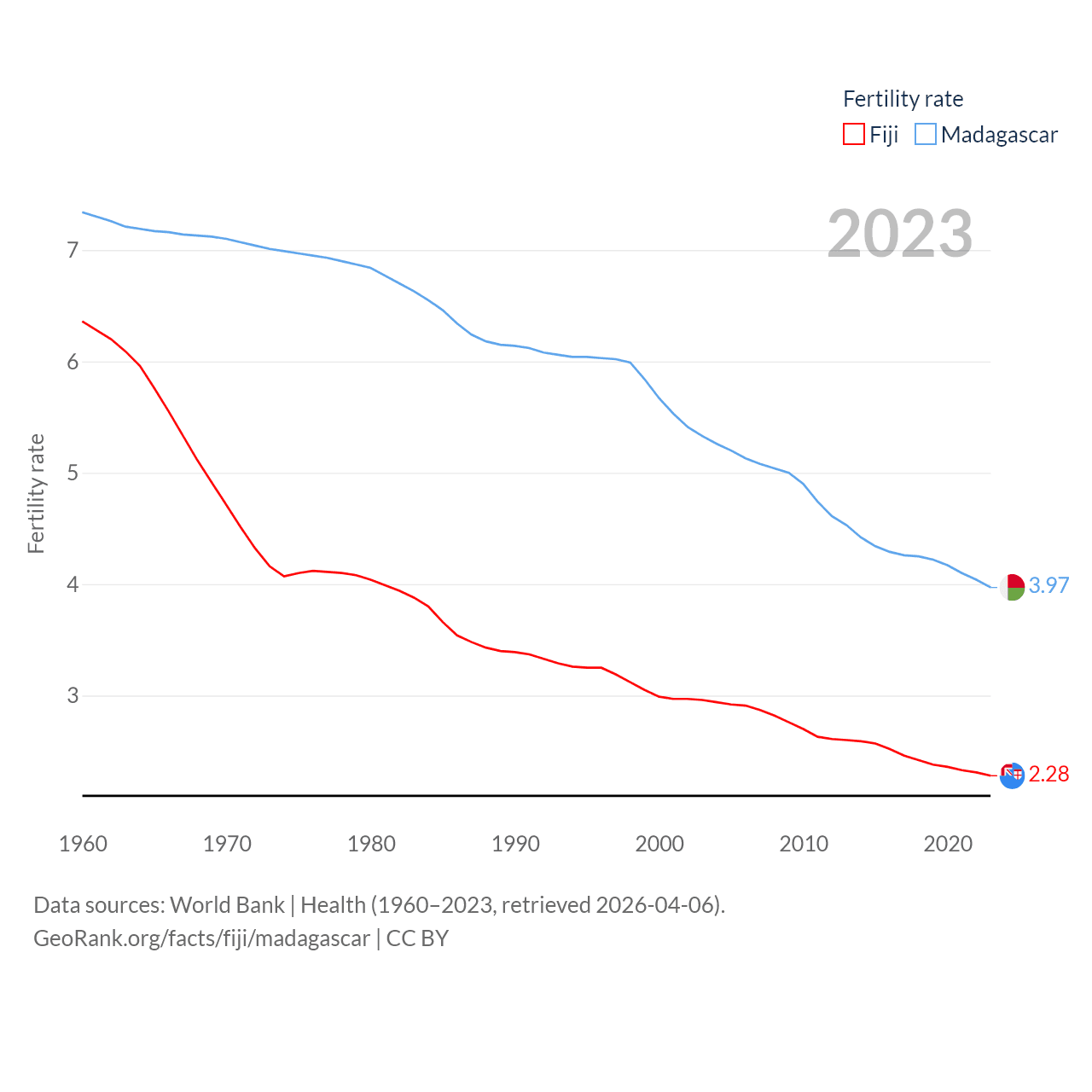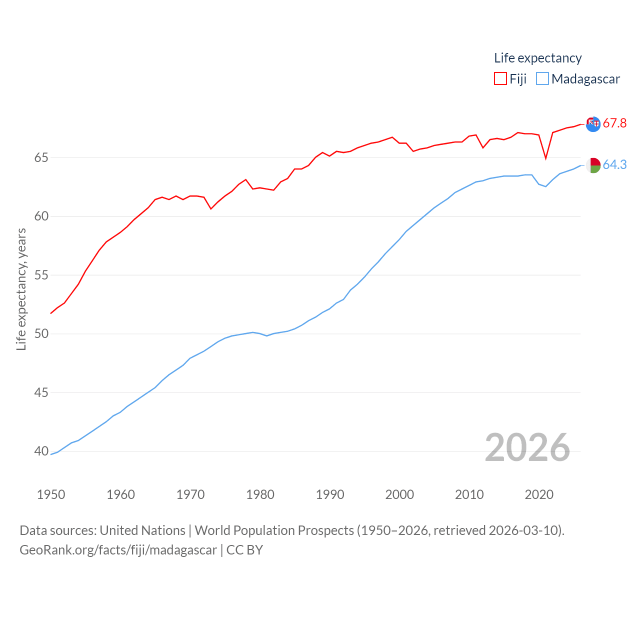 Fiji has a population of 929K (ranked 159/197), compared with 32M in Madagascar (ranked 49/197). Fiji's land area is 7,054 sq mi versus 224,634 sq mi for Madagascar (ranked 152nd vs. 44th).