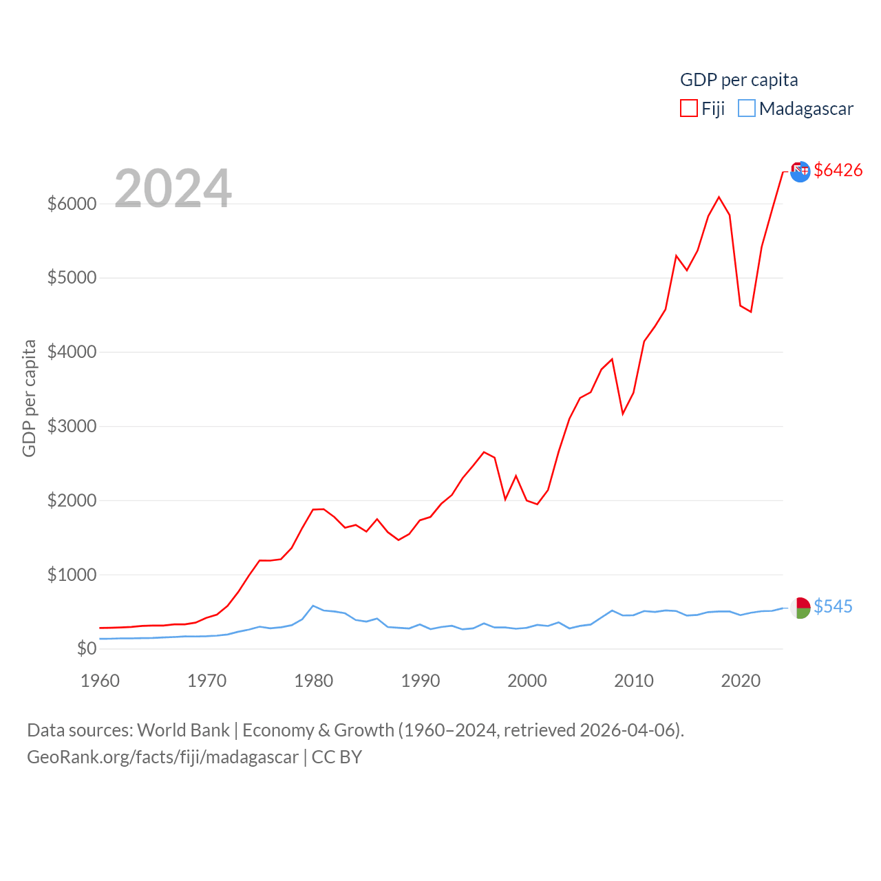 By GDP, Fiji ranks 161/197 ($5.97B) and Madagascar ranks 136/197 ($17.4B). By GDP per capita, Fiji ranks 108/197 ($6,426), while Madagascar ranks 193/197 ($545).