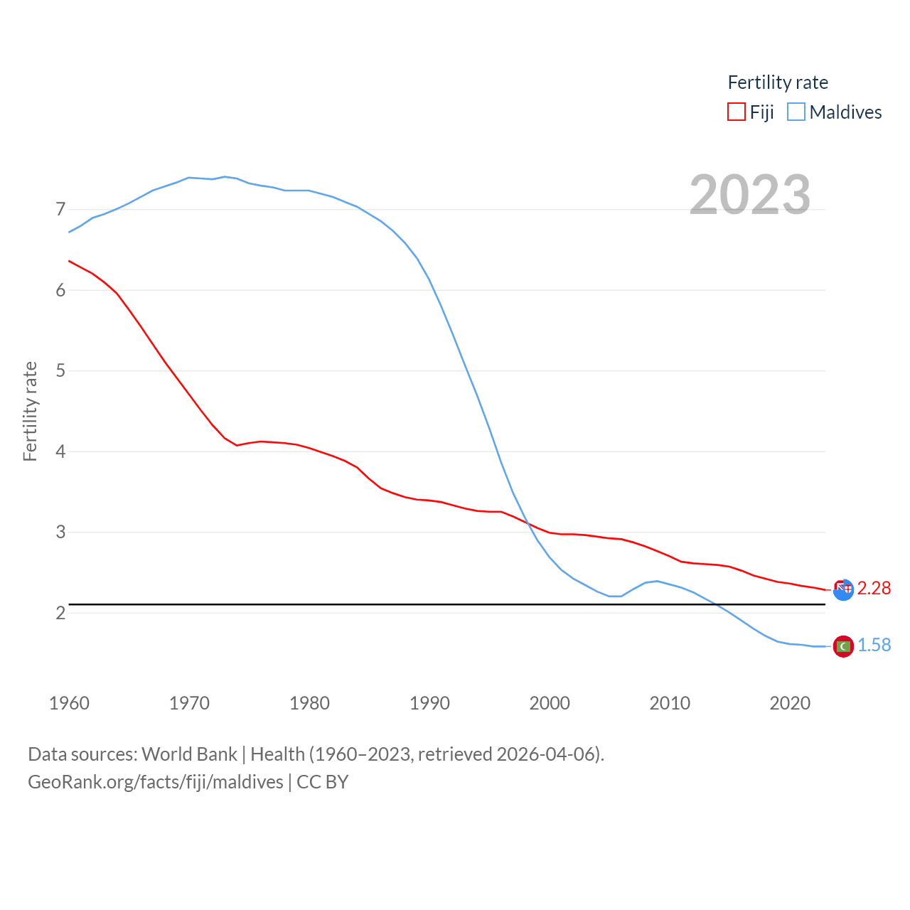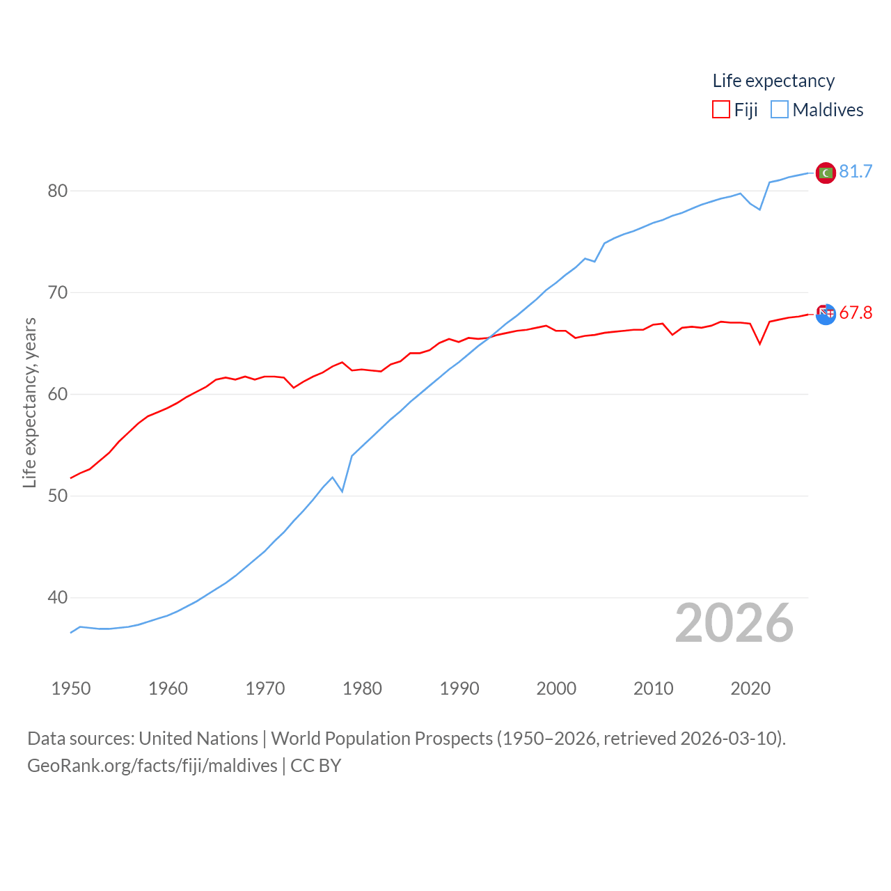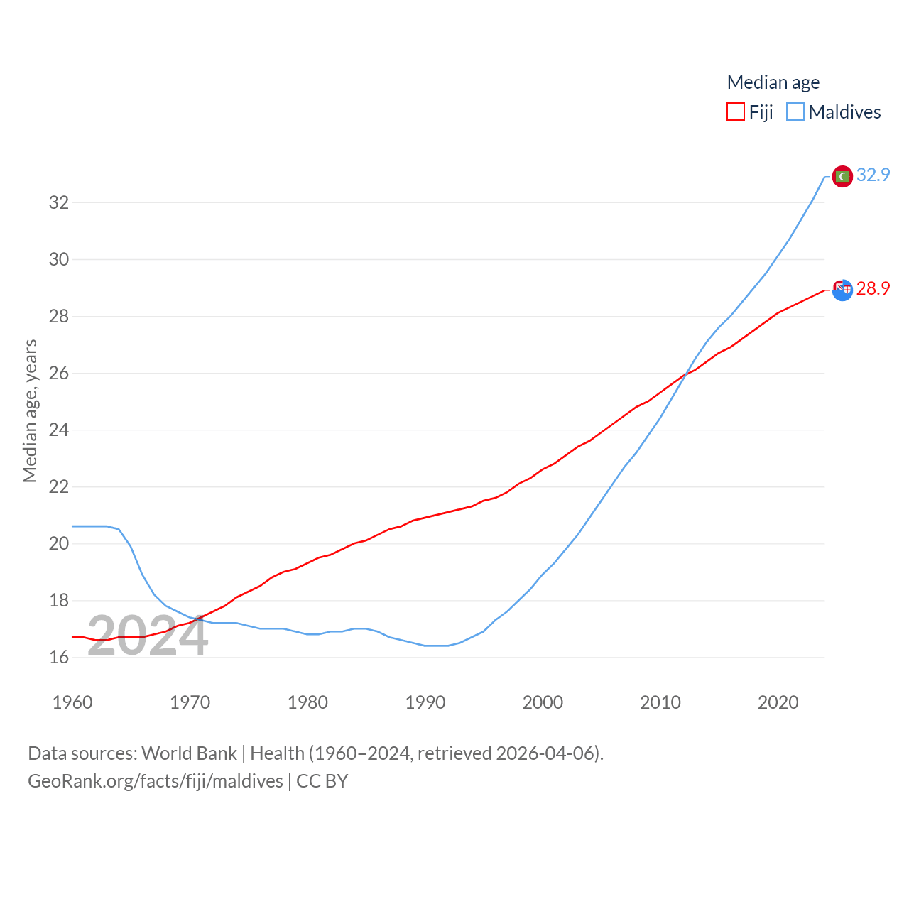 Fiji has a population of 929K (ranked 159/197), compared with 528K in Maldives (ranked 168/197). Fiji's land area is 7,054 sq mi versus 115.1 sq mi for Maldives (ranked 152nd vs. 188th).