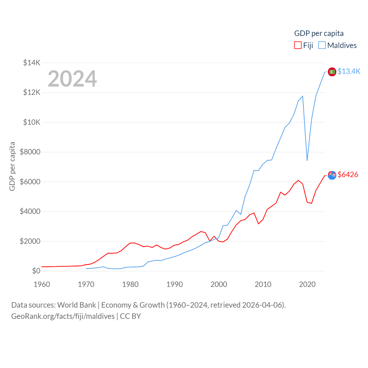 By GDP, Fiji ranks 161/197 ($5.97B) and Maldives ranks 159/197 ($7.06B). By GDP per capita, Fiji ranks 108/197 ($6,426), while Maldives ranks 75/197 ($13,379).