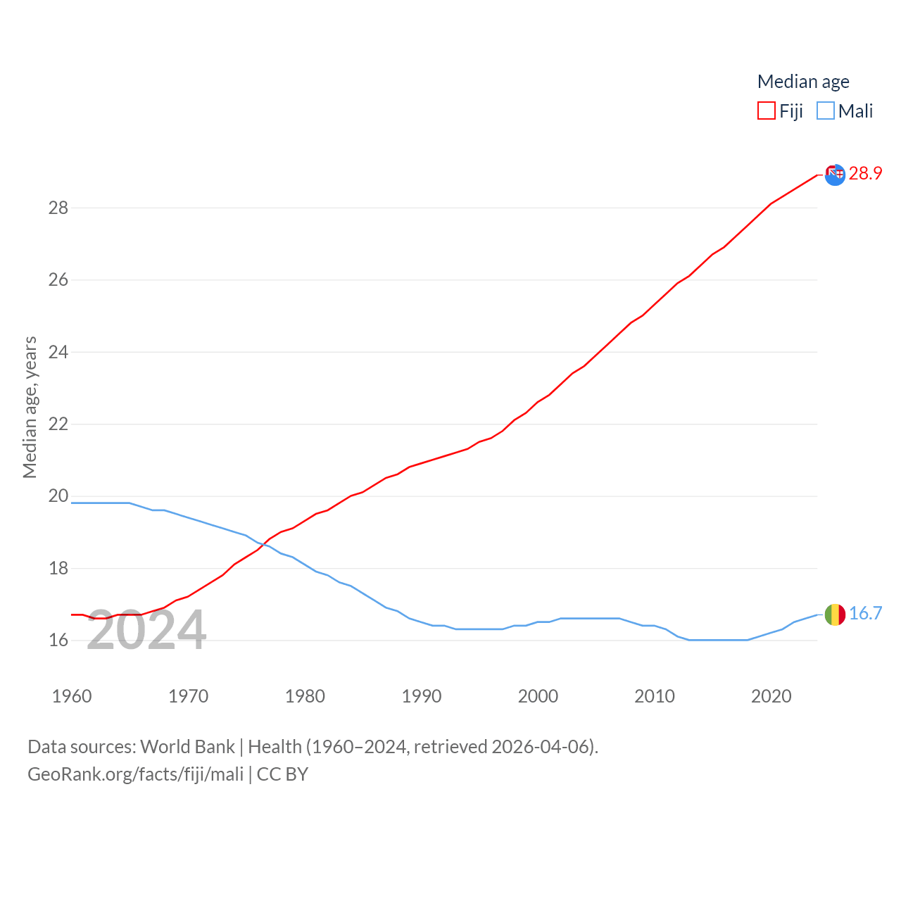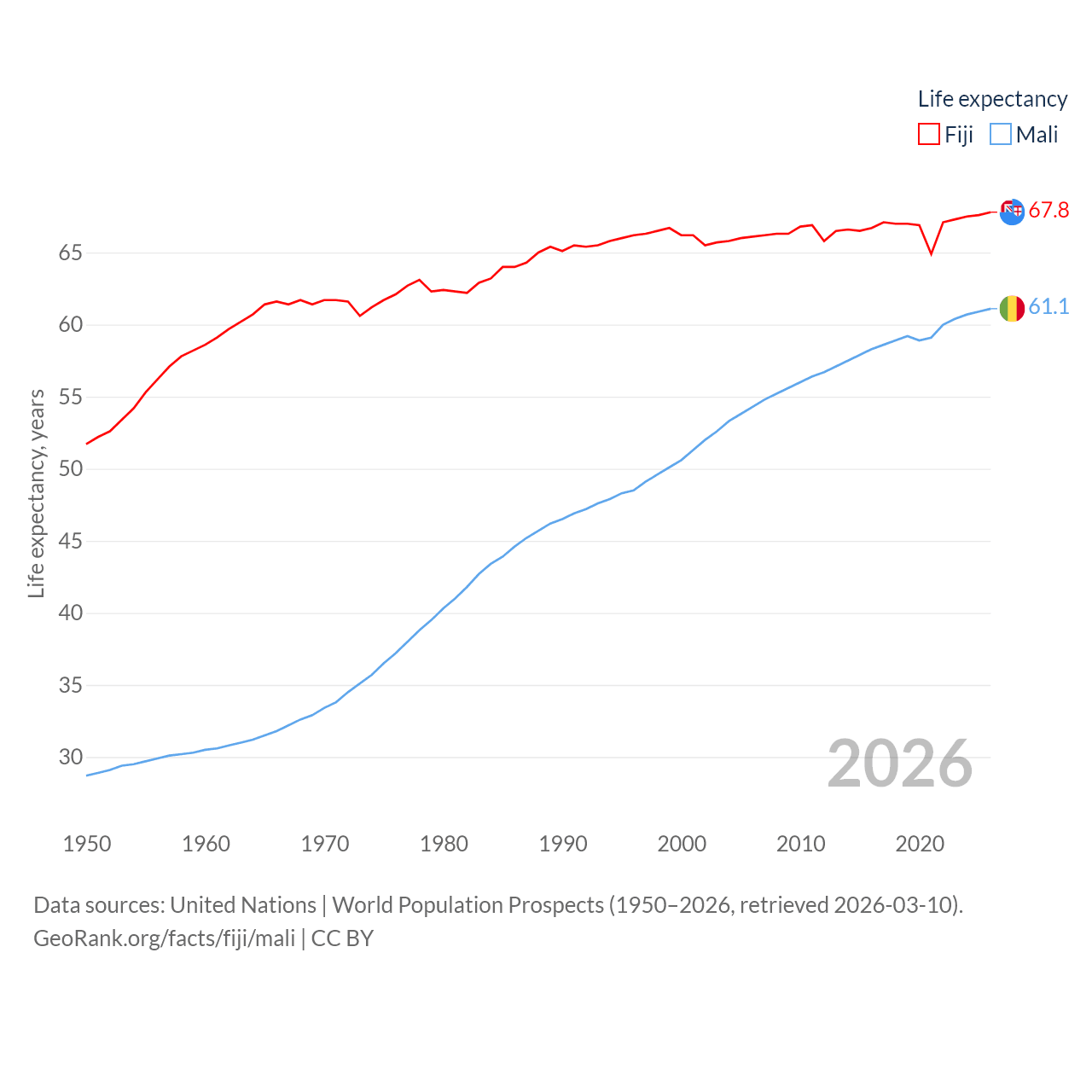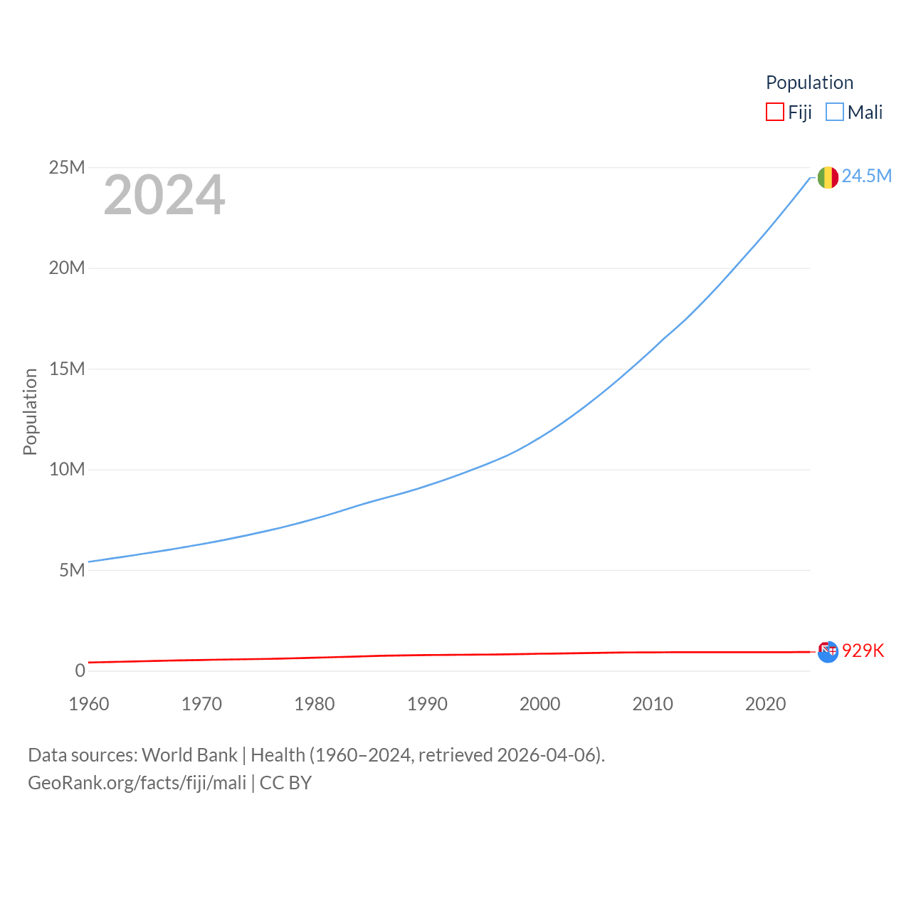 Fiji has a population of 929K (ranked 159/197), compared with 24.5M in Mali (ranked 58/197). Fiji's land area is 7,054 sq mi versus 471,118 sq mi for Mali (ranked 152nd vs. 23rd).