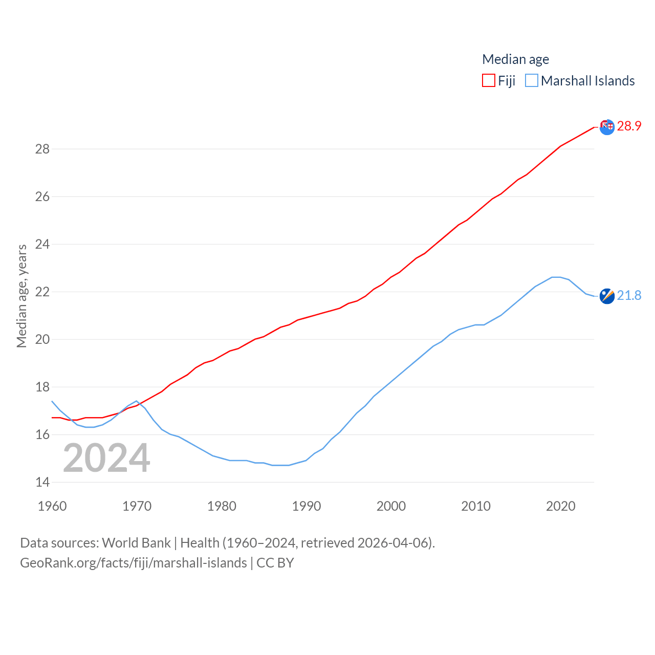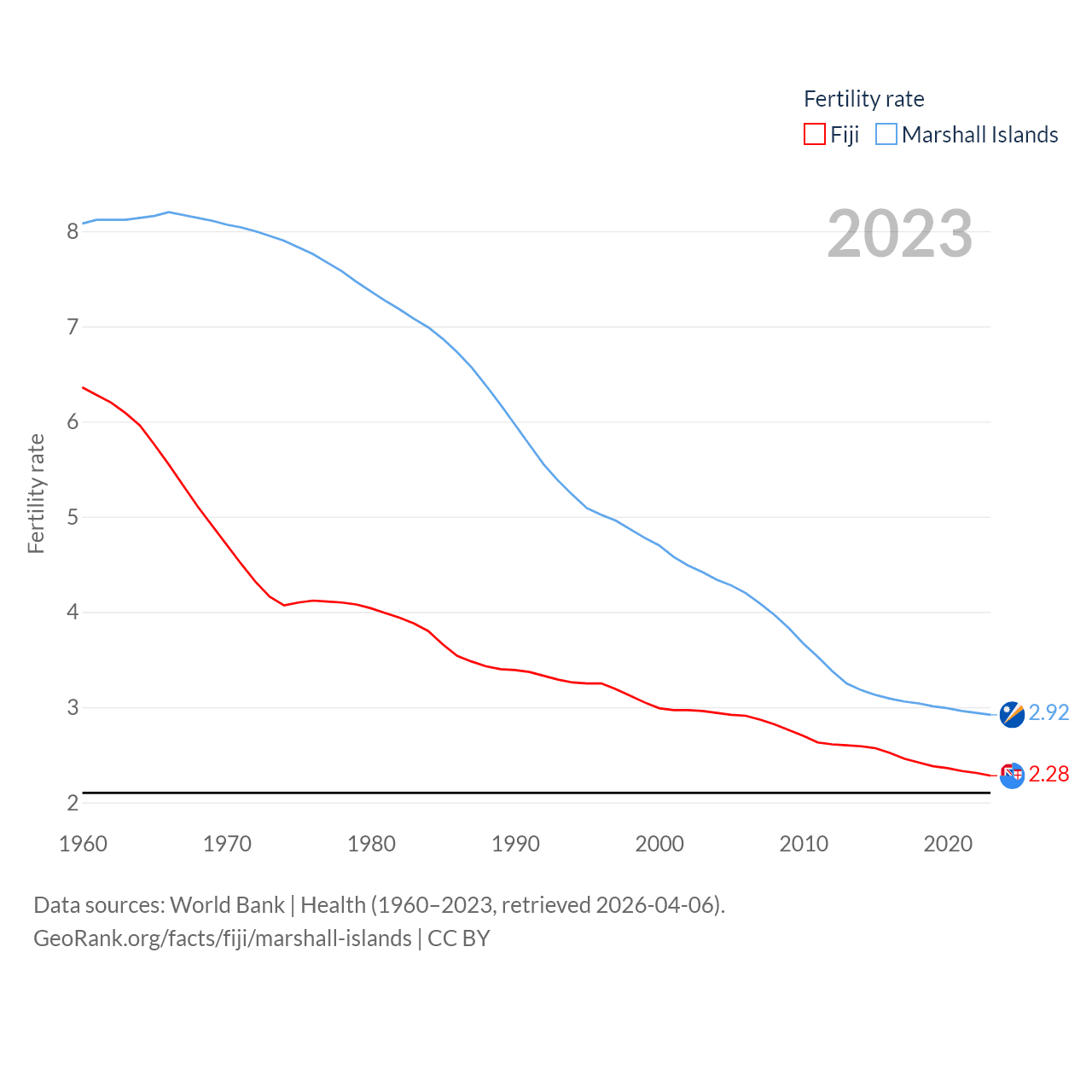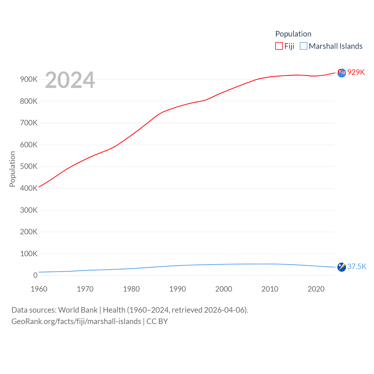 Fiji has a population of 929K (ranked 159/197), compared with 37.5K in The Marshall Islands (ranked 192/197). Fiji's land area is 7,054 sq mi versus 69.5 sq mi for The Marshall Islands (ranked 152nd vs. 191st).