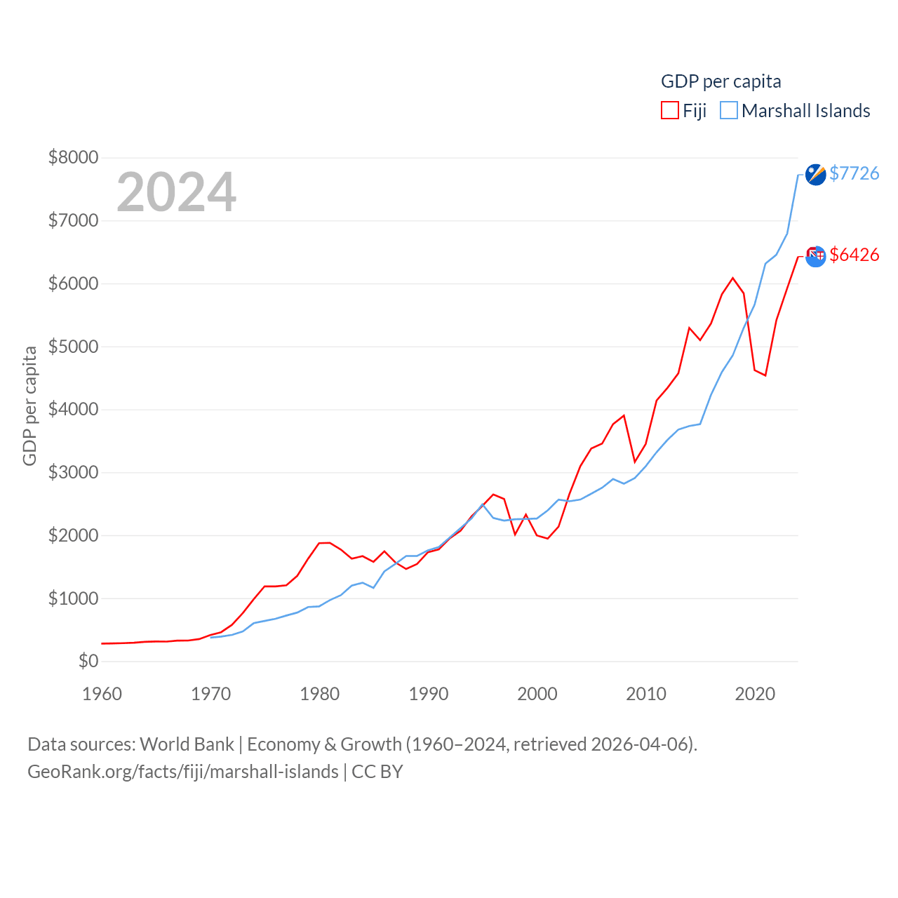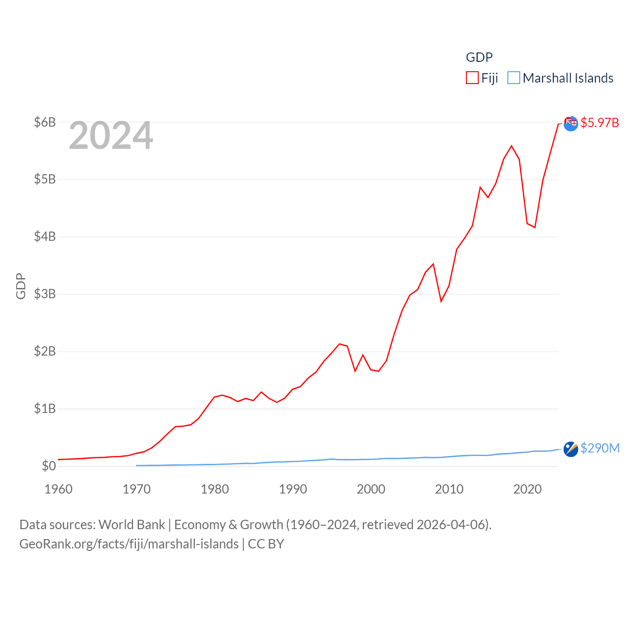 By GDP, Fiji ranks 161/197 ($5.97B) and The Marshall Islands ranks 193/197 ($290M). By GDP per capita, Fiji ranks 108/197 ($6,426), while The Marshall Islands ranks 96/197 ($7,726).