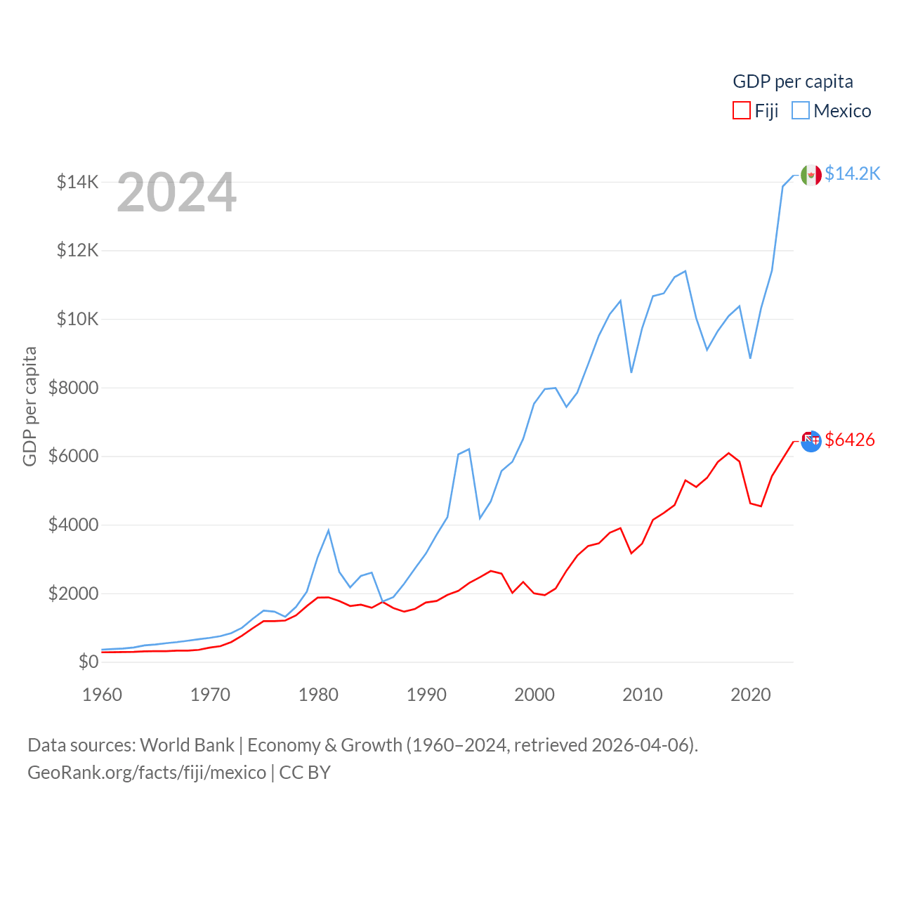 By GDP, Fiji ranks 161/197 ($5.97B) and Mexico ranks 13/197 ($1.86T). By GDP per capita, Fiji ranks 108/197 ($6,426), while Mexico ranks 69/197 ($14,186).