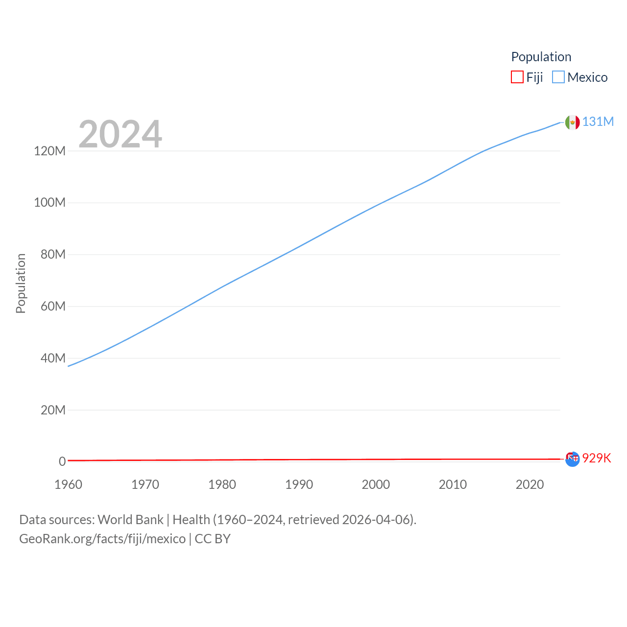Fiji has a population of 929K (ranked 159/197), compared with 131M in Mexico (ranked 11/197). Fiji's land area is 7,054 sq mi versus 750,563 sq mi for Mexico (ranked 152nd vs. 13th).