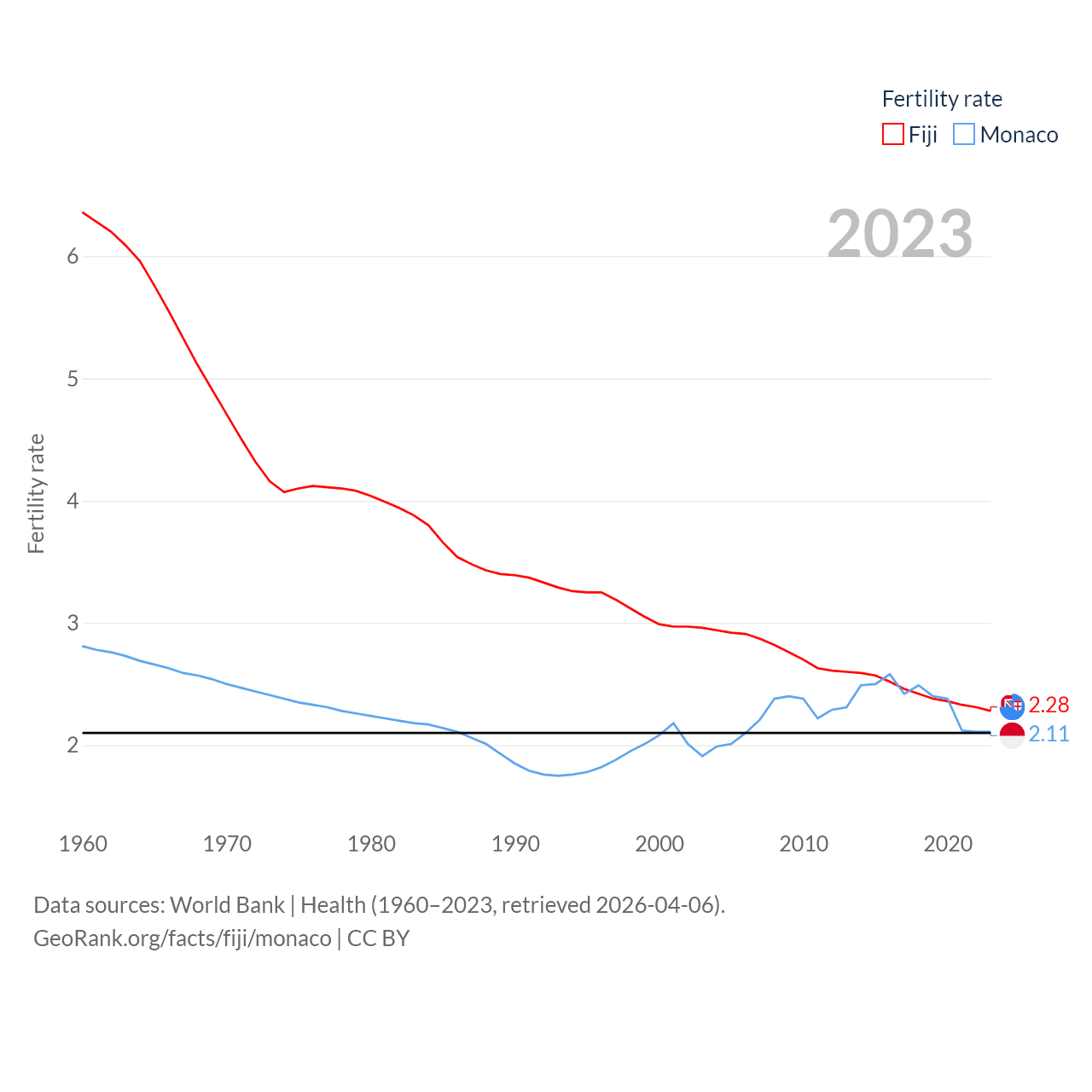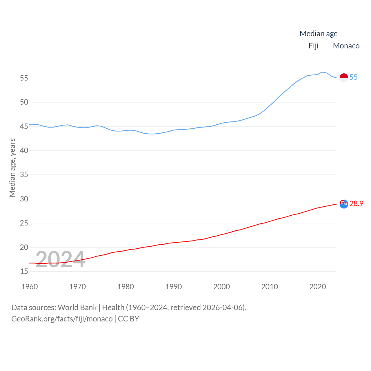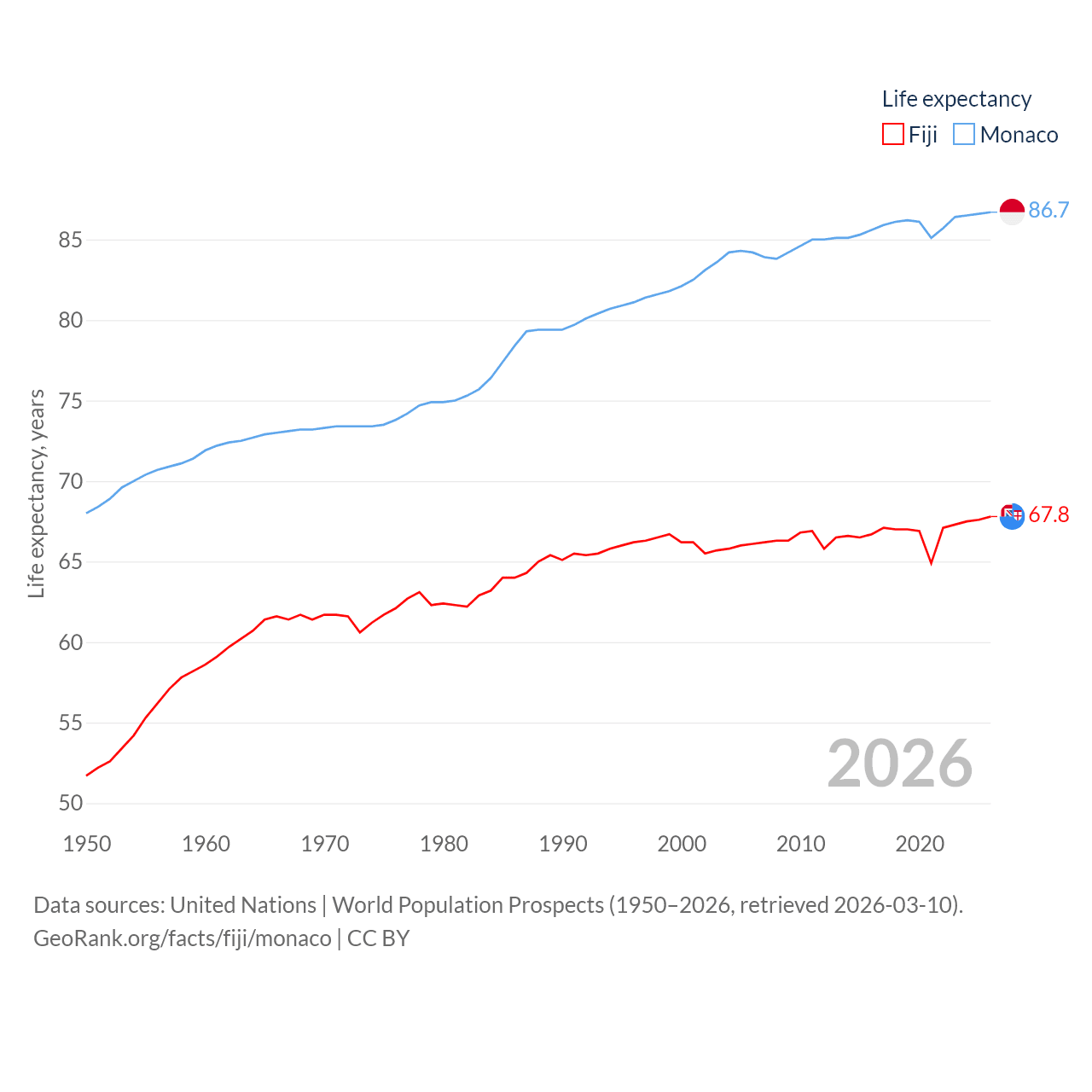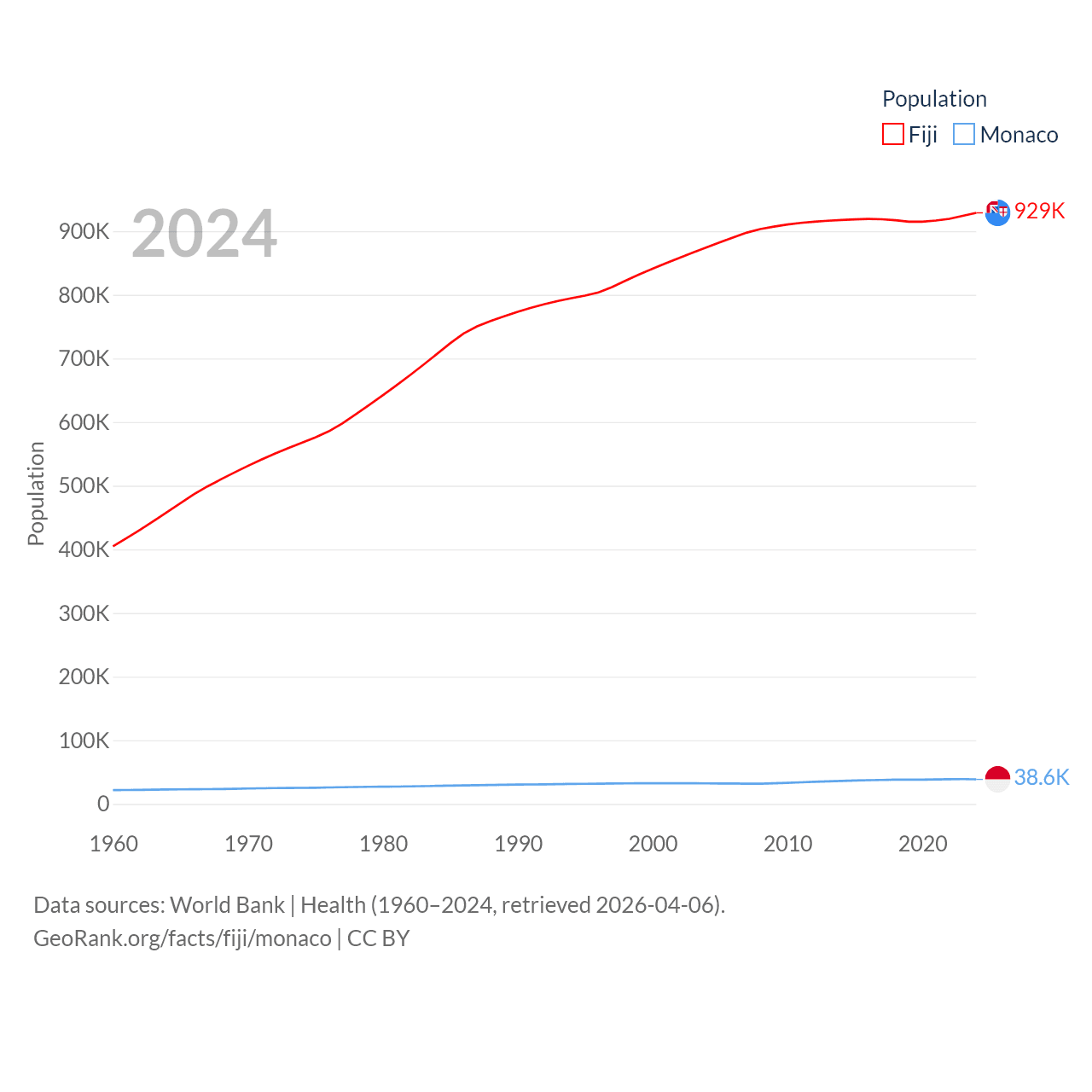 Fiji has a population of 929K (ranked 159/197), compared with 38.6K in Monaco (ranked 191/197). Fiji's land area is 7,054 sq mi versus 0.8 sq mi for Monaco (ranked 152nd vs. 196th).