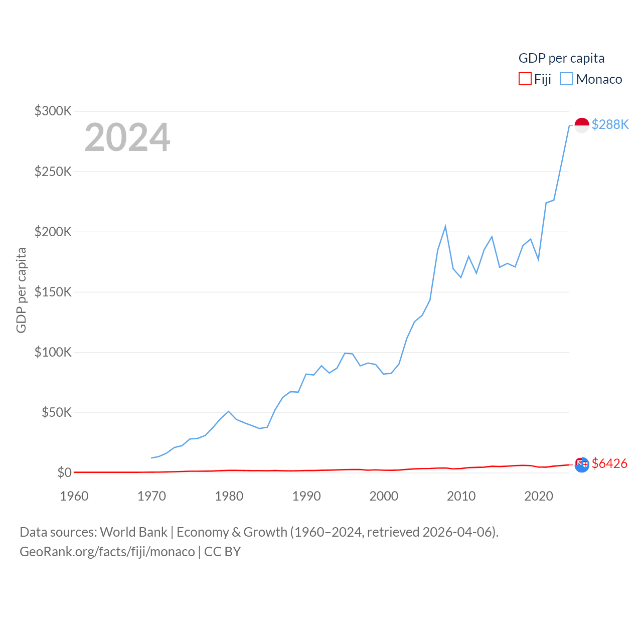 By GDP, Fiji ranks 161/197 ($5.97B) and Monaco ranks 152/197 ($11.1B). By GDP per capita, Fiji ranks 108/197 ($6,426), while Monaco ranks 1/197 ($288,001).