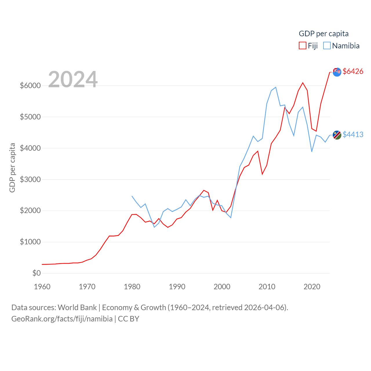 By GDP, Fiji ranks 161/197 ($5.97B) and Namibia ranks 147/197 ($13.4B). By GDP per capita, Fiji ranks 108/197 ($6,426), while Namibia ranks 126/197 ($4,413).