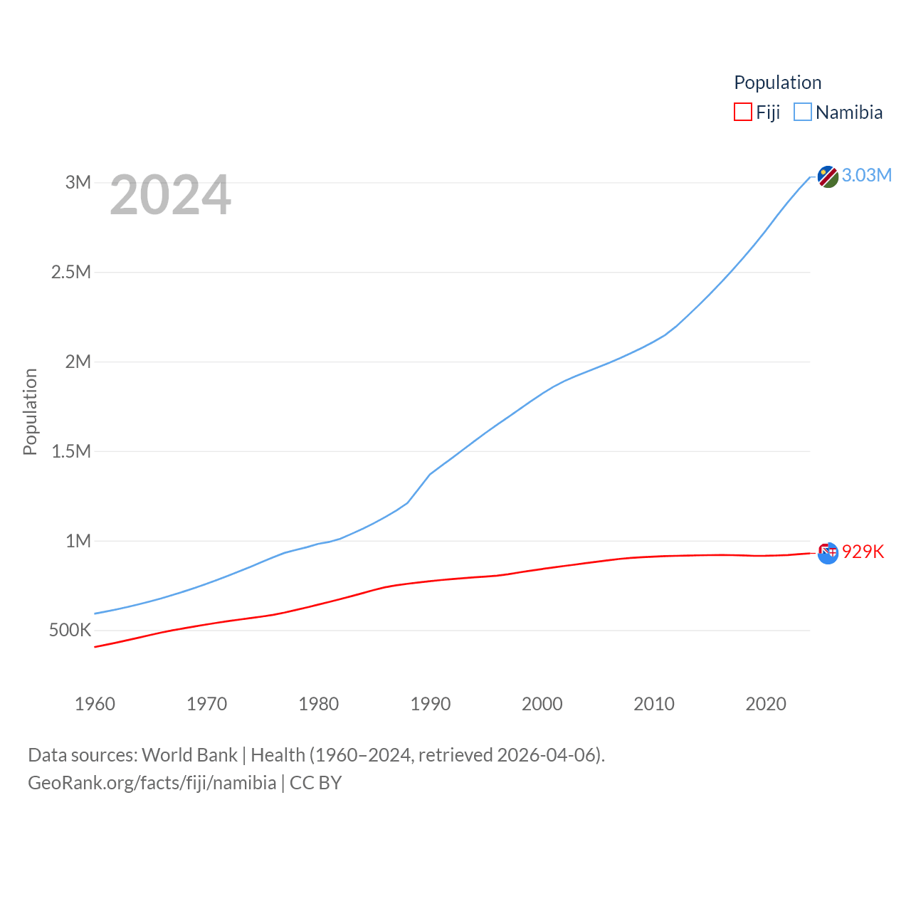 Fiji has a population of 929K (ranked 159/197), compared with 3.03M in Namibia (ranked 136/197). Fiji's land area is 7,054 sq mi versus 317,874 sq mi for Namibia (ranked 152nd vs. 33rd).