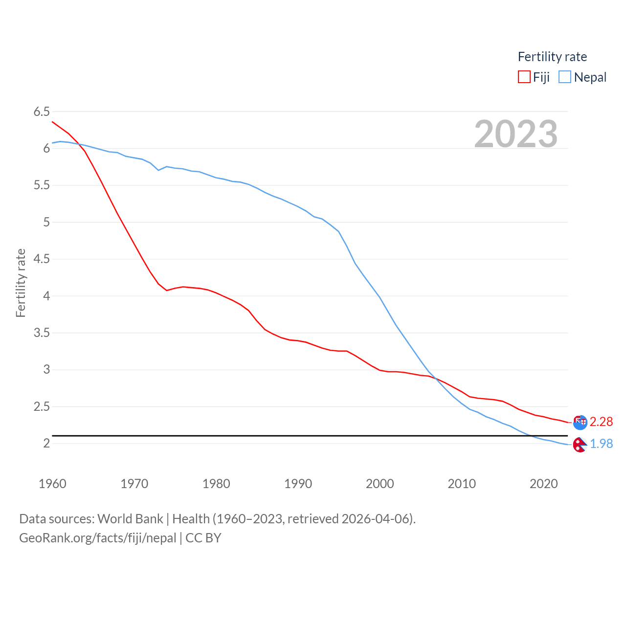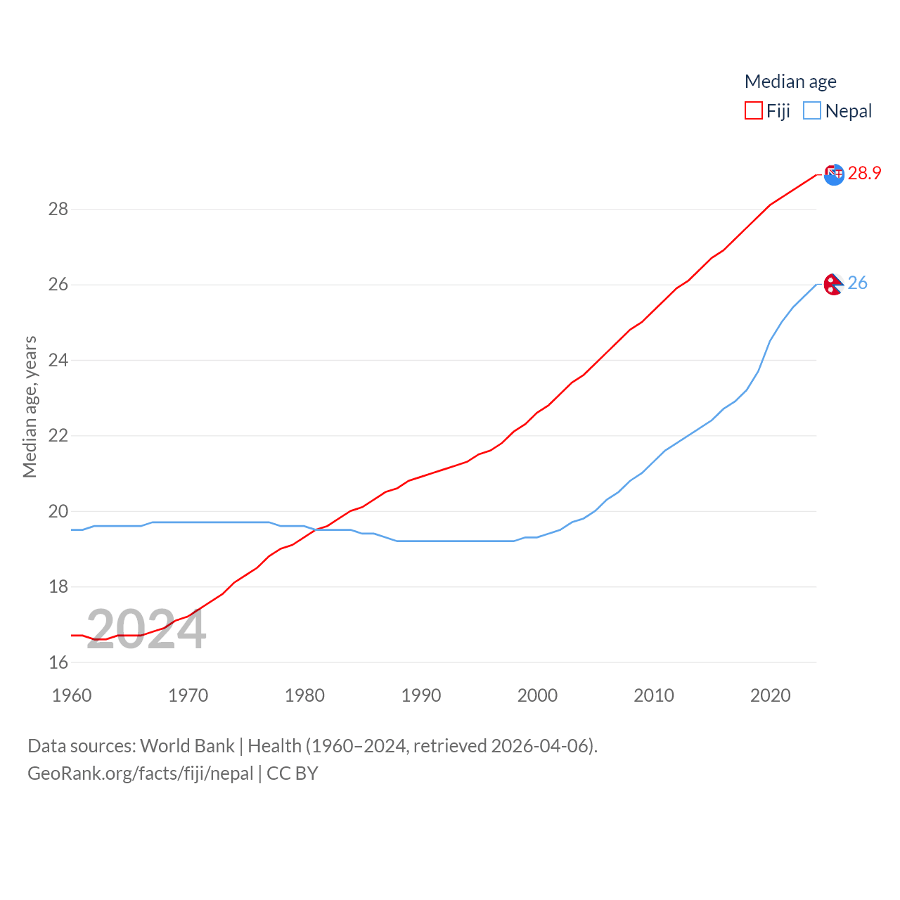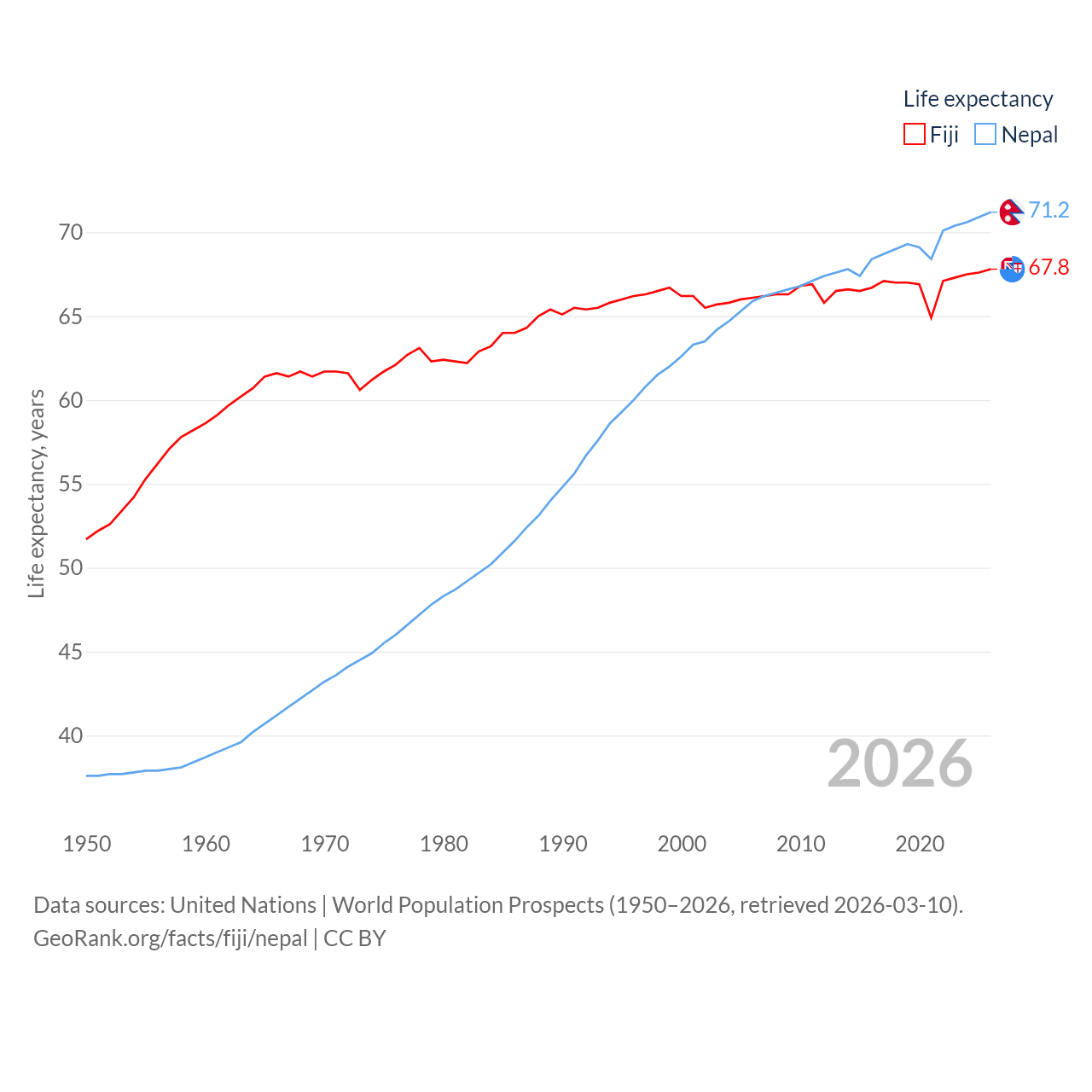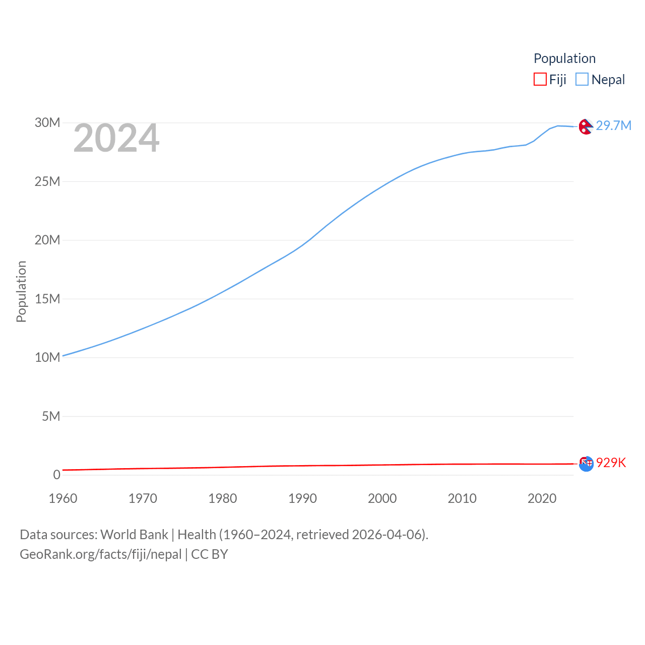 Fiji has a population of 929K (ranked 159/197), compared with 29.7M in Nepal (ranked 51/197). Fiji's land area is 7,054 sq mi versus 55,348 sq mi for Nepal (ranked 152nd vs. 92nd).