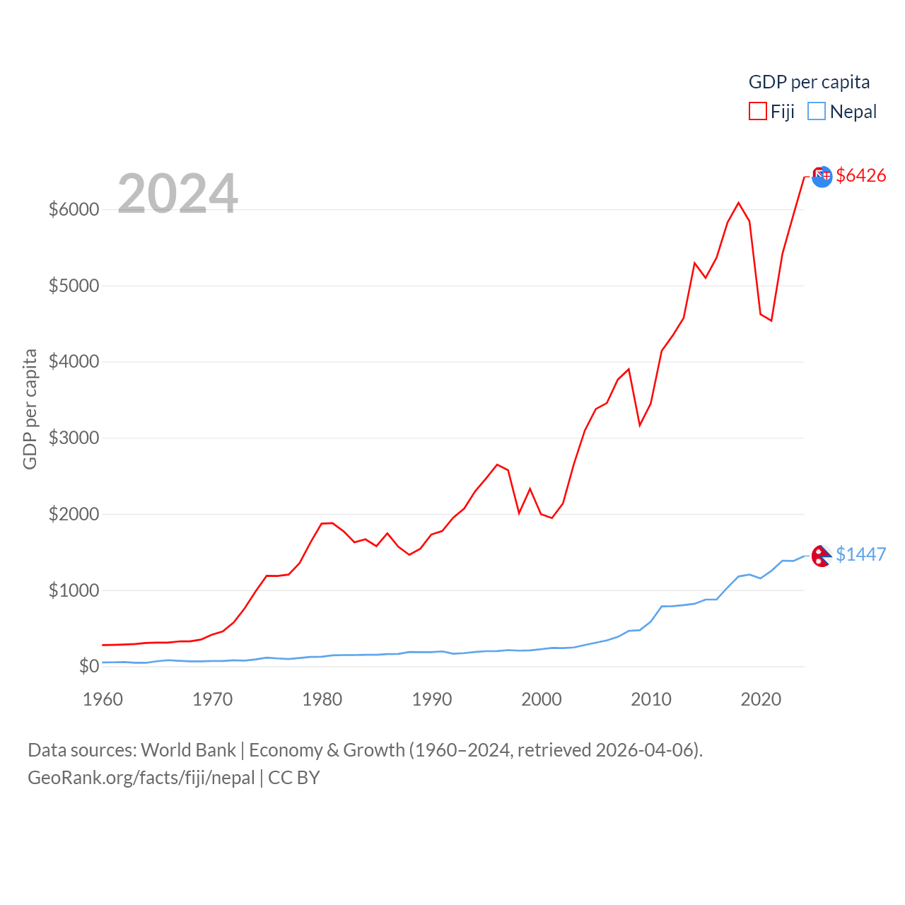 By GDP, Fiji ranks 161/197 ($5.97B) and Nepal ranks 101/197 ($42.9B). By GDP per capita, Fiji ranks 108/197 ($6,426), while Nepal ranks 164/197 ($1,447).