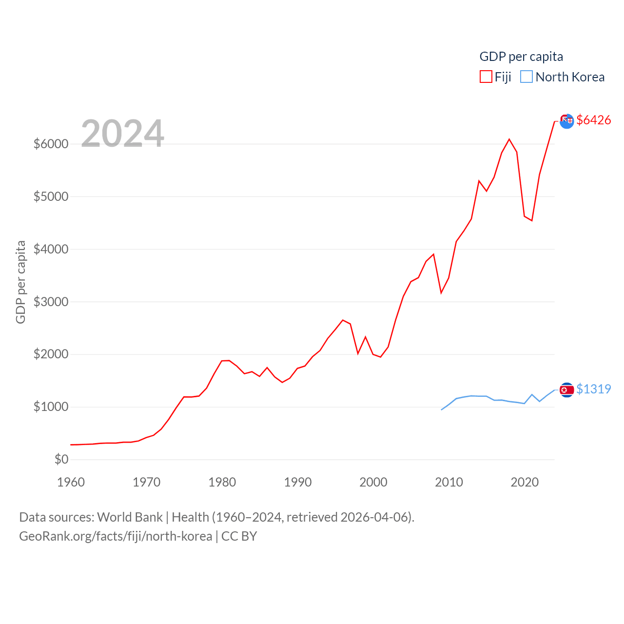 By GDP, Fiji ranks 161/197 ($5.97B) and North Korea ranks 106/197 ($34.9B). By GDP per capita, Fiji ranks 108/197 ($6,426), while North Korea ranks 168/197 ($1,319).