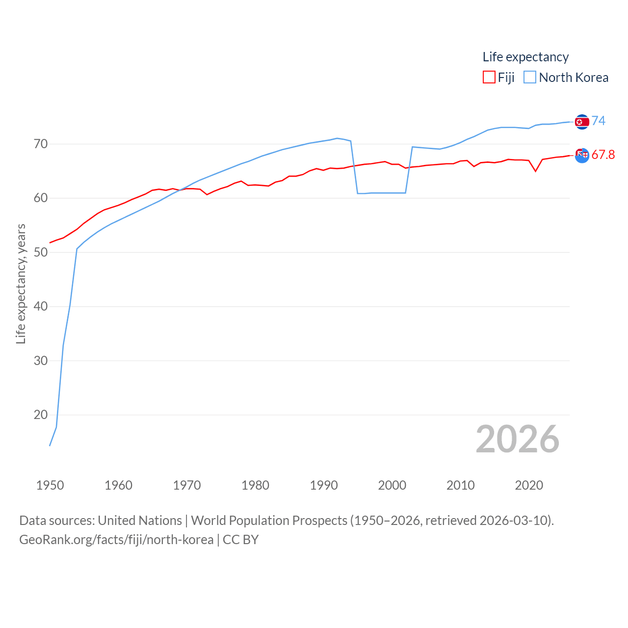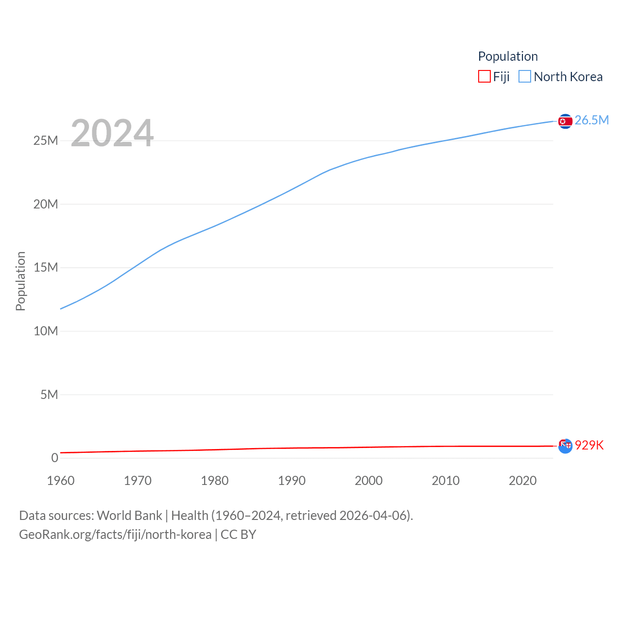 Fiji has a population of 929K (ranked 159/197), compared with 26.5M in North Korea (ranked 56/197). Fiji's land area is 7,054 sq mi versus 46,491 sq mi for North Korea (ranked 152nd vs. 97th).