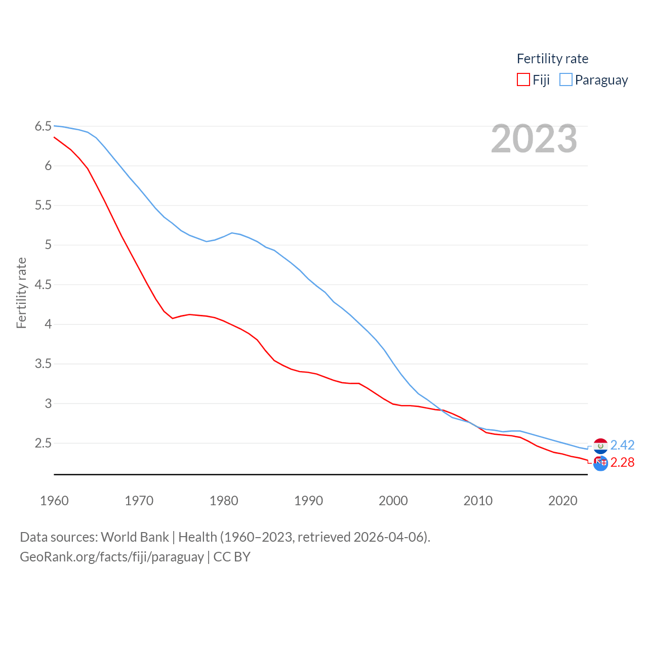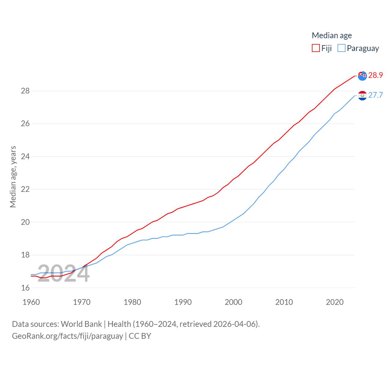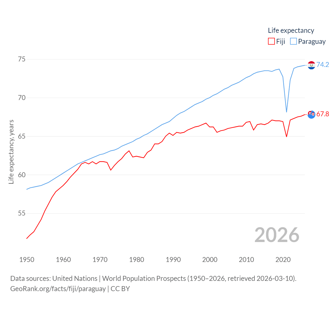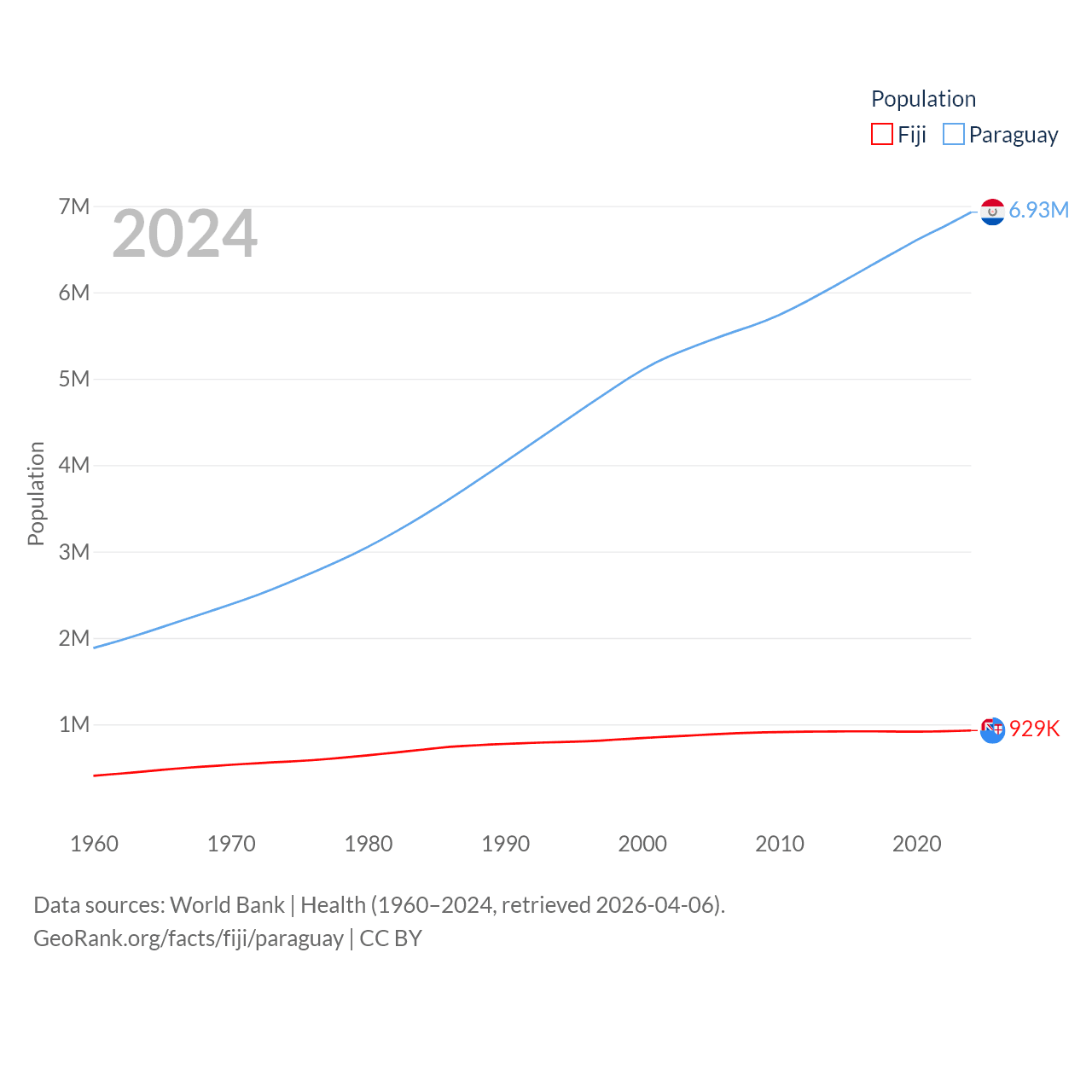 Fiji has a population of 929K (ranked 159/197), compared with 6.93M in Paraguay (ranked 107/197). Fiji's land area is 7,054 sq mi versus 152,901 sq mi for Paraguay (ranked 152nd vs. 59th).