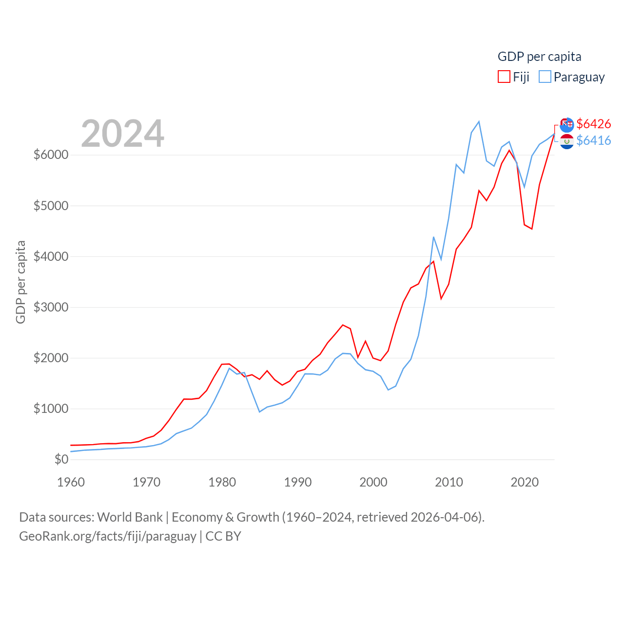 By GDP, Fiji ranks 161/197 ($5.97B) and Paraguay ranks 98/197 ($44.5B). By GDP per capita, Fiji ranks 108/197 ($6,426), while Paraguay ranks 109/197 ($6,416).