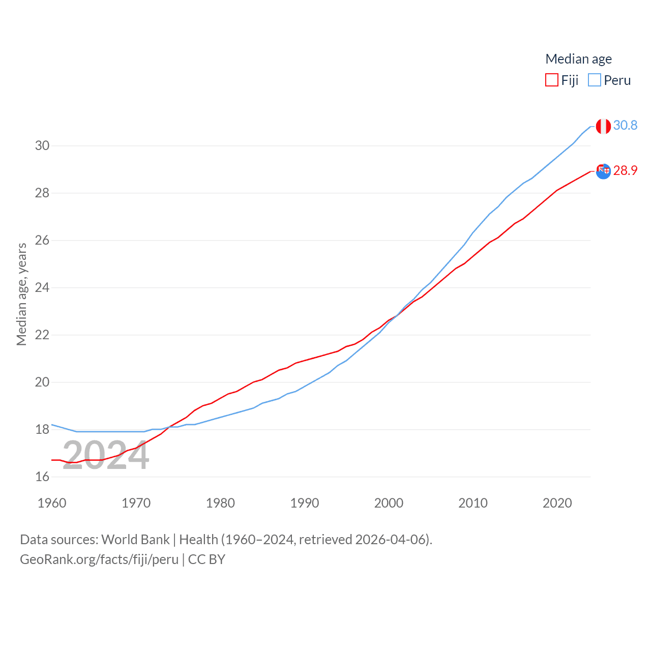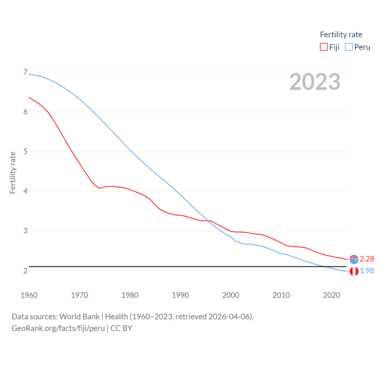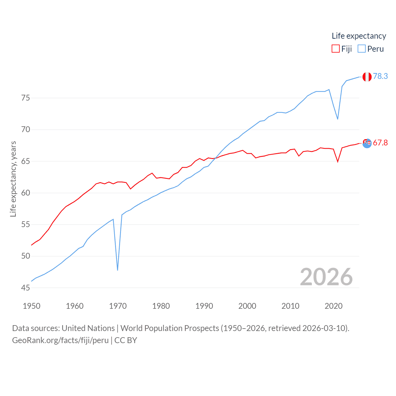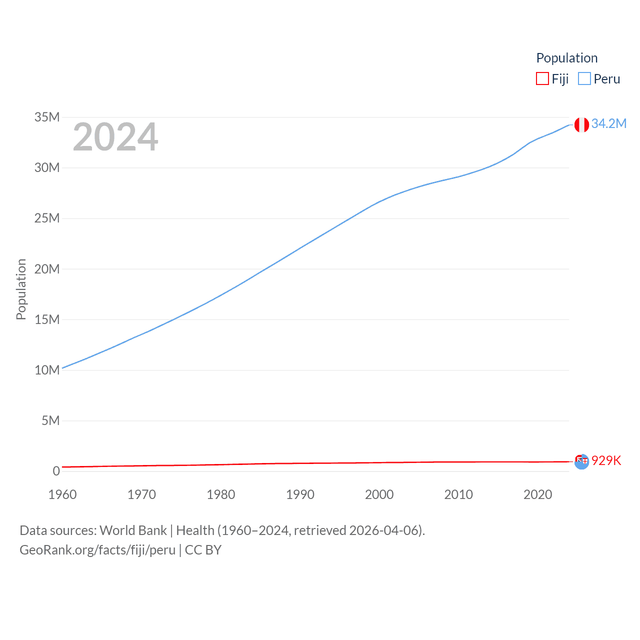 Fiji has a population of 929K (ranked 159/197), compared with 34.2M in Peru (ranked 48/197). Fiji's land area is 7,054 sq mi versus 494,211 sq mi for Peru (ranked 152nd vs. 19th).