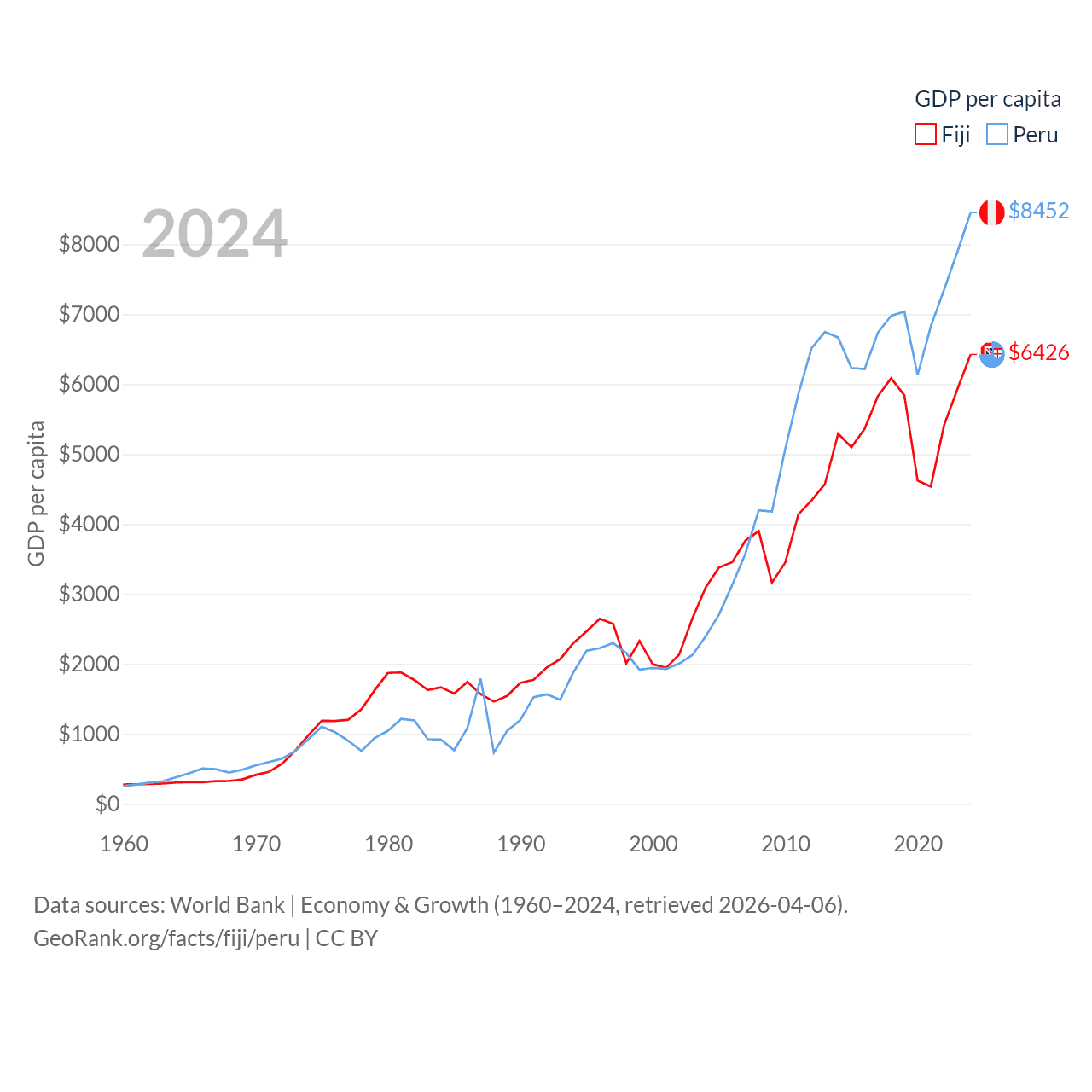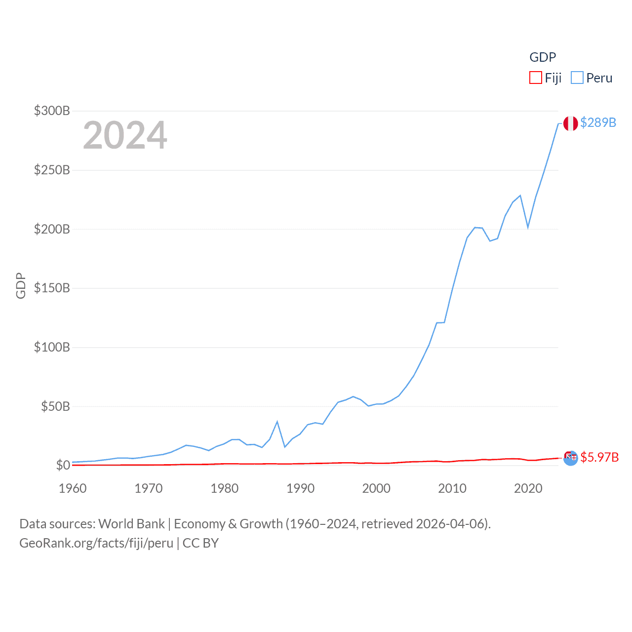 By GDP, Fiji ranks 161/197 ($5.97B) and Peru ranks 49/197 ($289B). By GDP per capita, Fiji ranks 108/197 ($6,426), while Peru ranks 91/197 ($8,452).