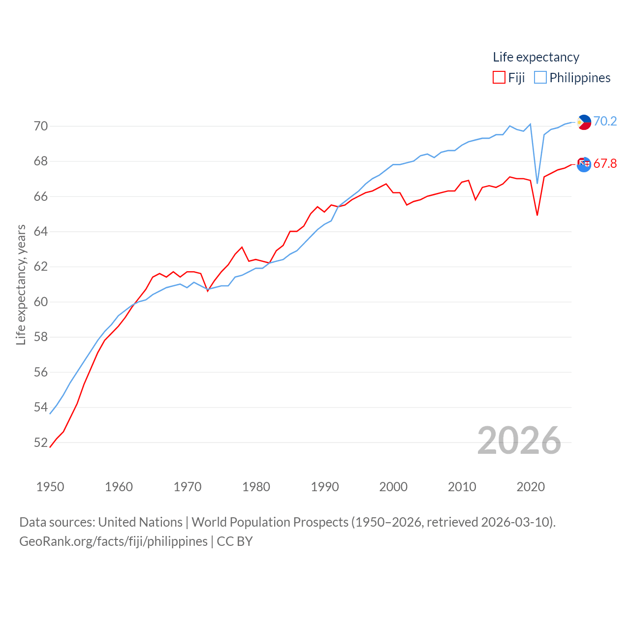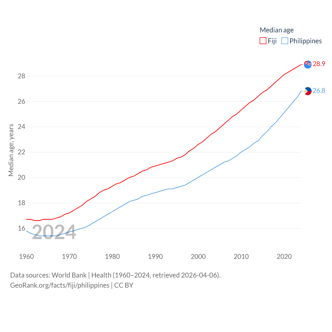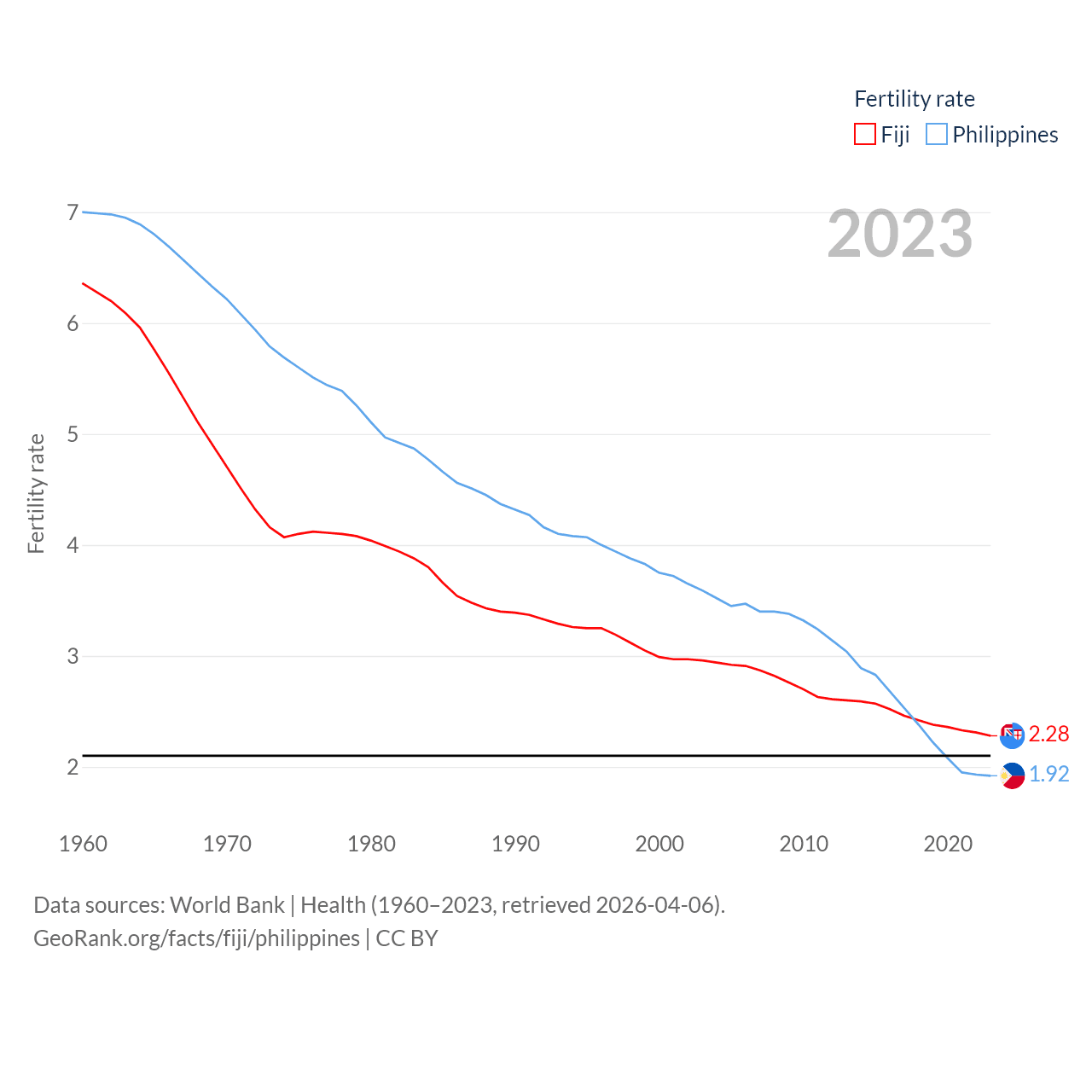 Fiji has a population of 929K (ranked 159/197), compared with 116M in The Philippines (ranked 14/197). Fiji's land area is 7,054 sq mi versus 115,124 sq mi for The Philippines (ranked 152nd vs. 71st).