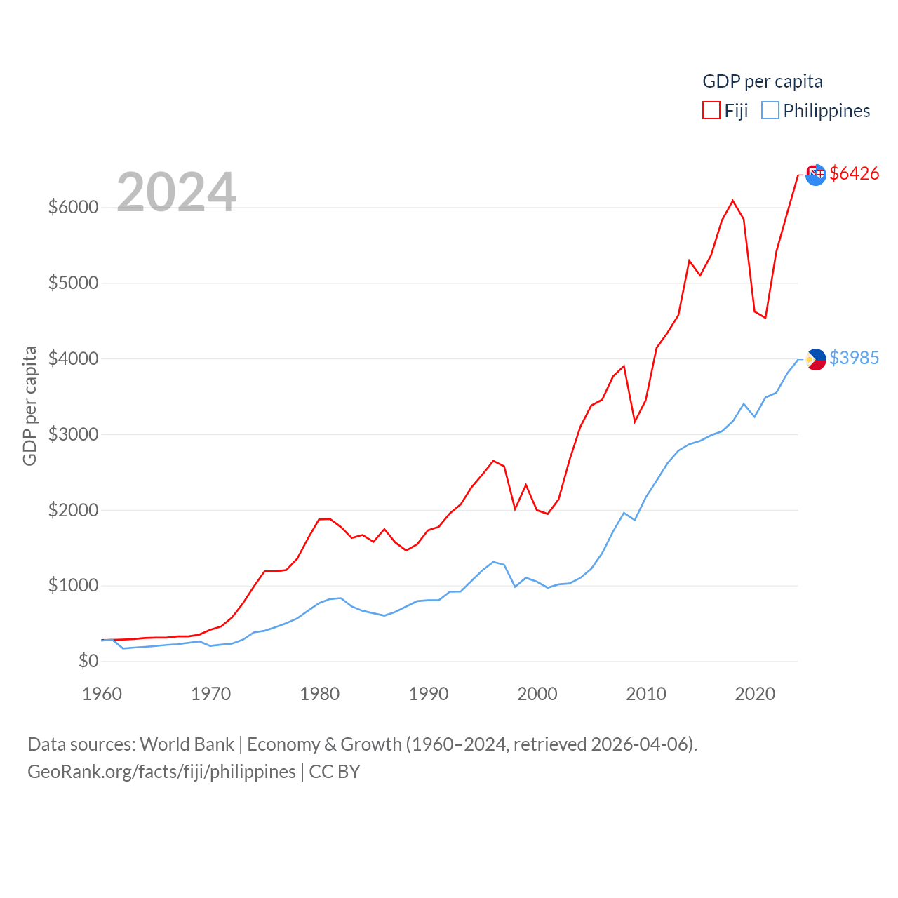 By GDP, Fiji ranks 161/197 ($5.97B) and The Philippines ranks 35/197 ($462B). By GDP per capita, Fiji ranks 108/197 ($6,426), while The Philippines ranks 130/197 ($3,985).