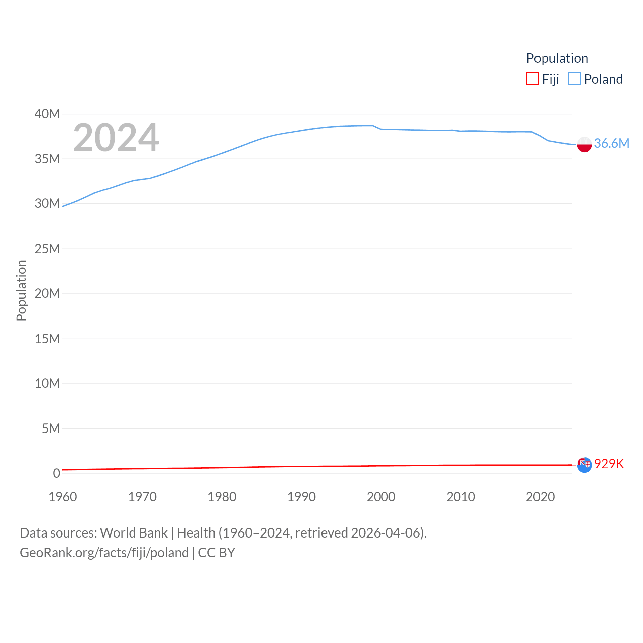 Fiji has a population of 929K (ranked 159/197), compared with 36.6M in Poland (ranked 42/197). Fiji's land area is 7,054 sq mi versus 118,252 sq mi for Poland (ranked 152nd vs. 69th).