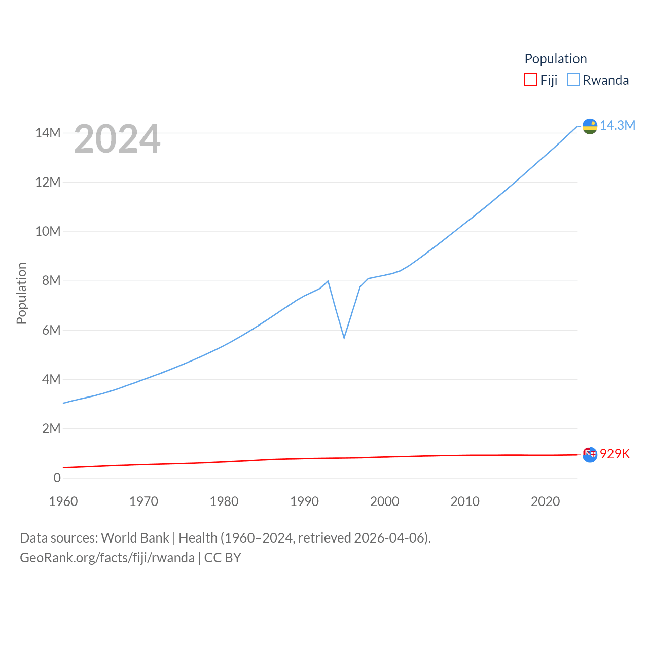 Fiji has a population of 929K (ranked 159/197), compared with 14.3M in Rwanda (ranked 77/197). Fiji's land area is 7,054 sq mi versus 9,525 sq mi for Rwanda (ranked 152nd vs. 146th).