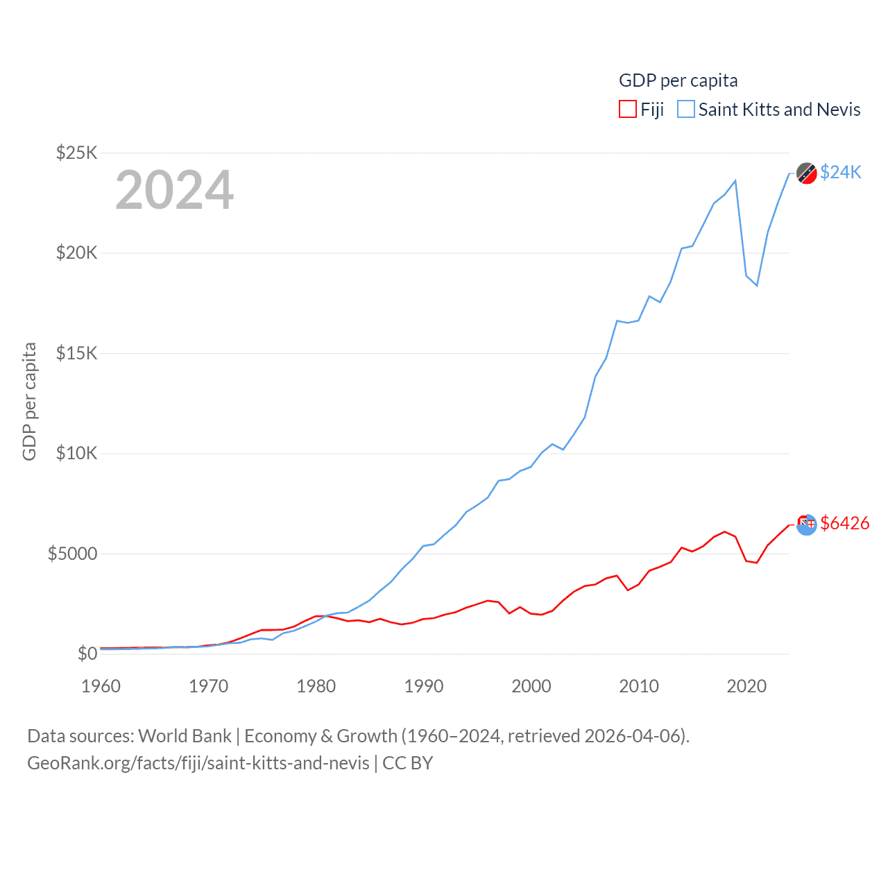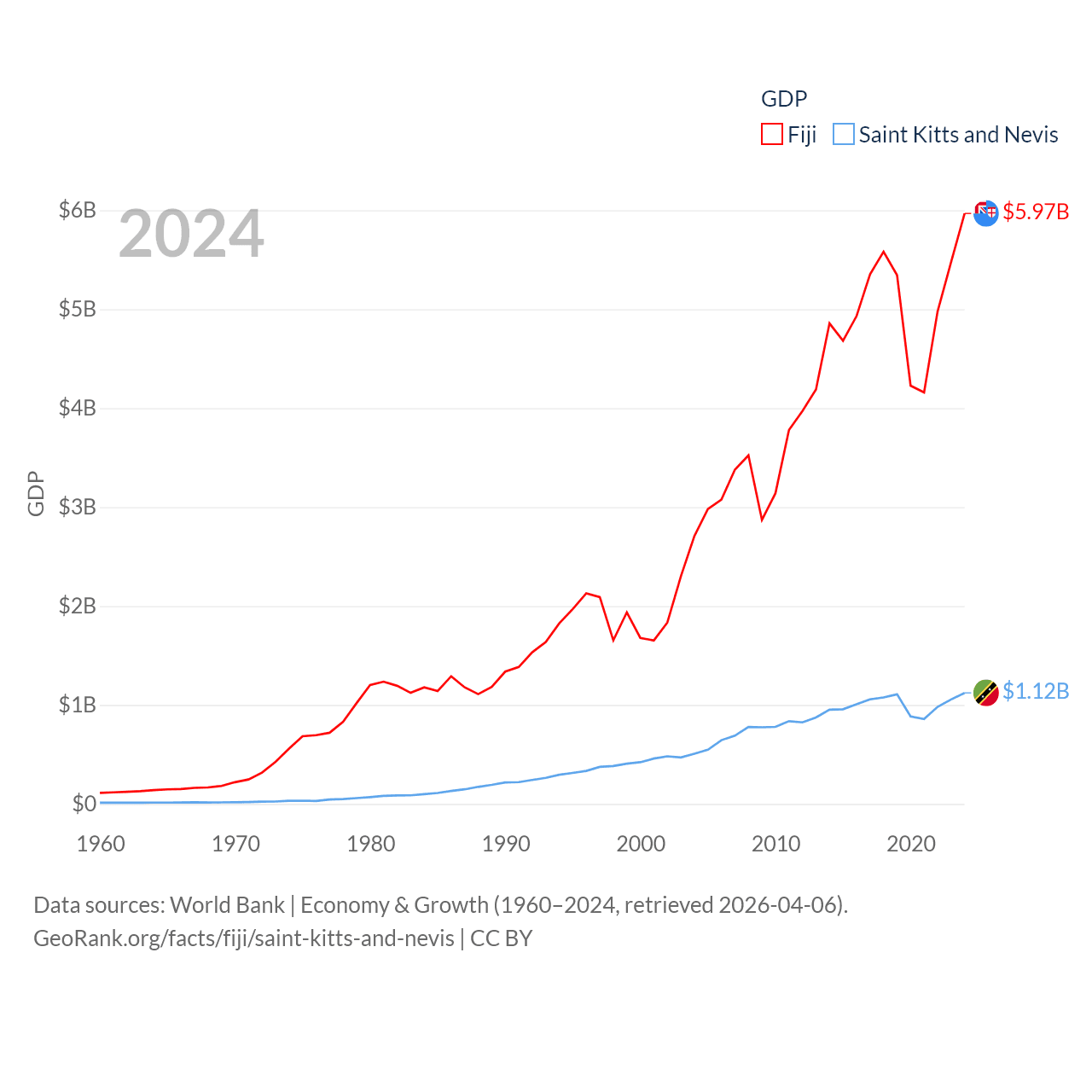 By GDP, Fiji ranks 161/197 ($5.97B) and Saint Kitts and Nevis ranks 187/197 ($1.12B). By GDP per capita, Fiji ranks 108/197 ($6,426), while Saint Kitts and Nevis ranks 51/197 ($23,961).