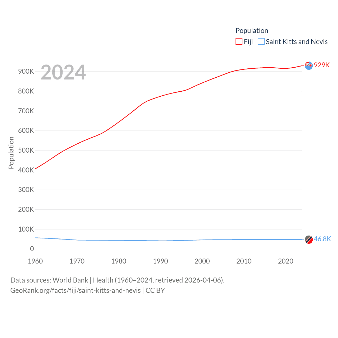 Fiji has a population of 929K (ranked 159/197), compared with 46.8K in Saint Kitts and Nevis (ranked 189/197). Fiji's land area is 7,054 sq mi versus 100.4 sq mi for Saint Kitts and Nevis (ranked 152nd vs. 189th).