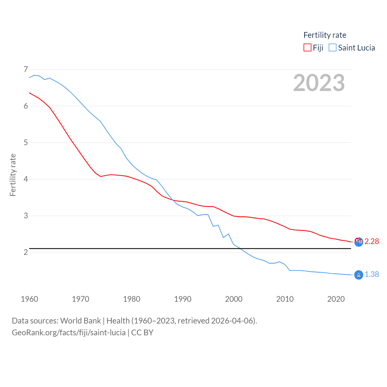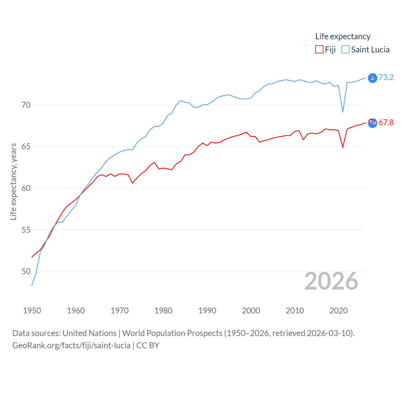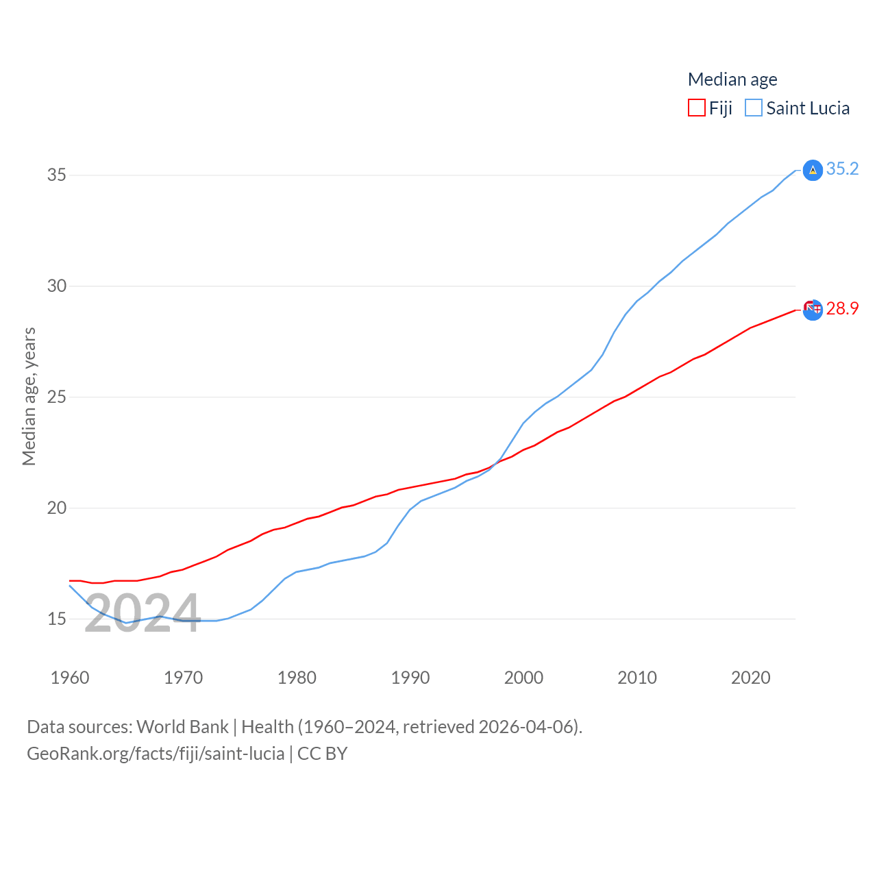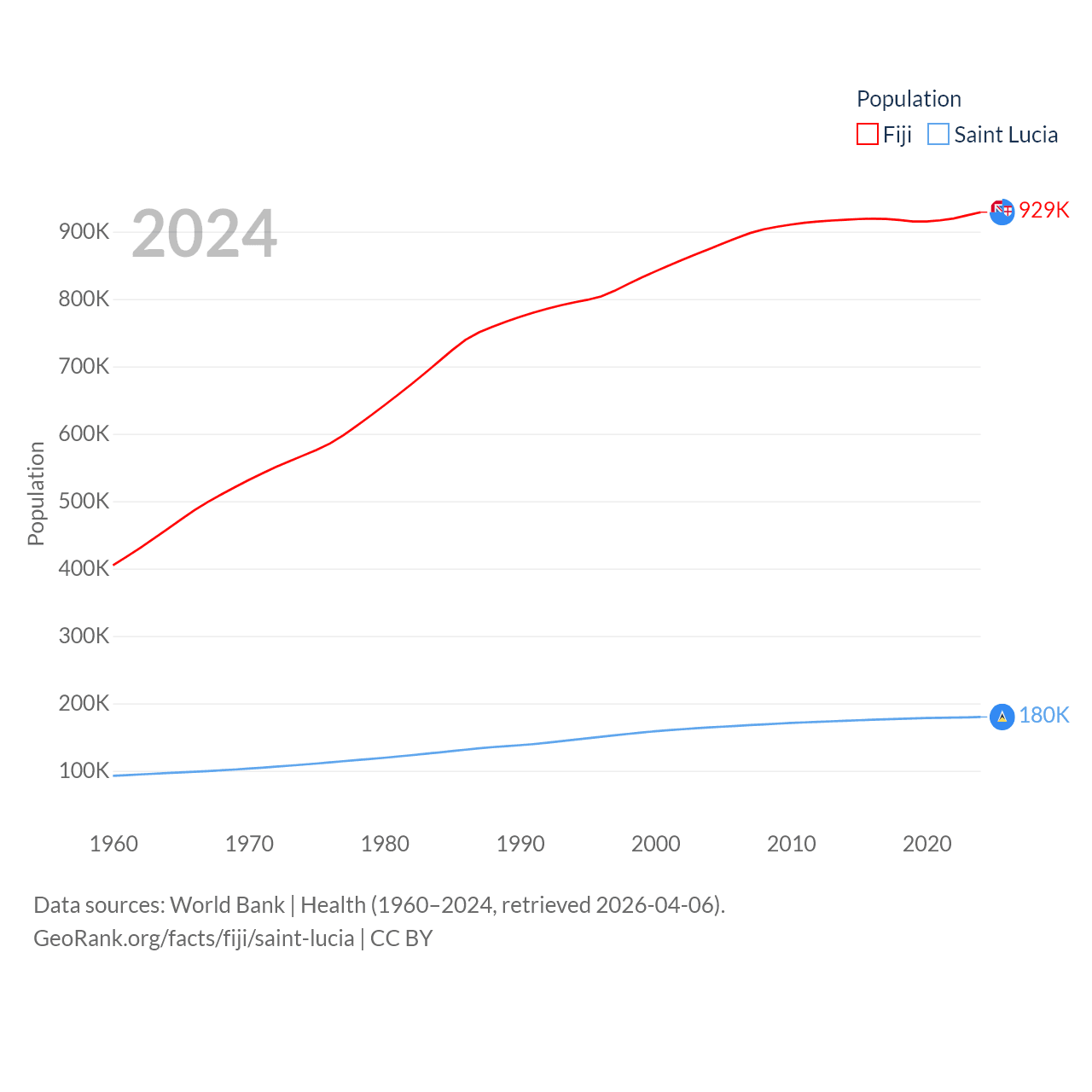 Fiji has a population of 929K (ranked 159/197), compared with 180K in Saint Lucia (ranked 178/197). Fiji's land area is 7,054 sq mi versus 235.5 sq mi for Saint Lucia (ranked 152nd vs. 178th).