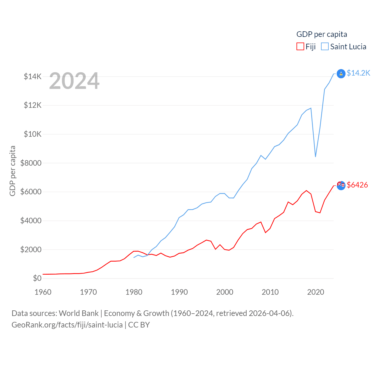 By GDP, Fiji ranks 161/197 ($5.97B) and Saint Lucia ranks 173/197 ($2.55B). By GDP per capita, Fiji ranks 108/197 ($6,426), while Saint Lucia ranks 70/197 ($14,182).