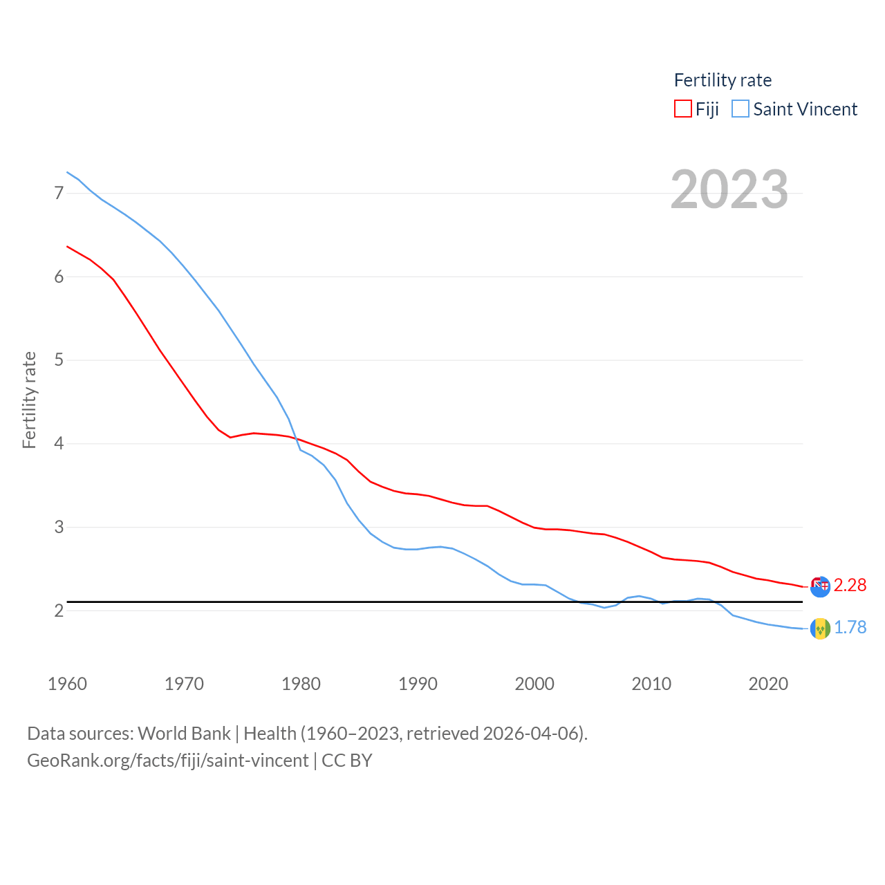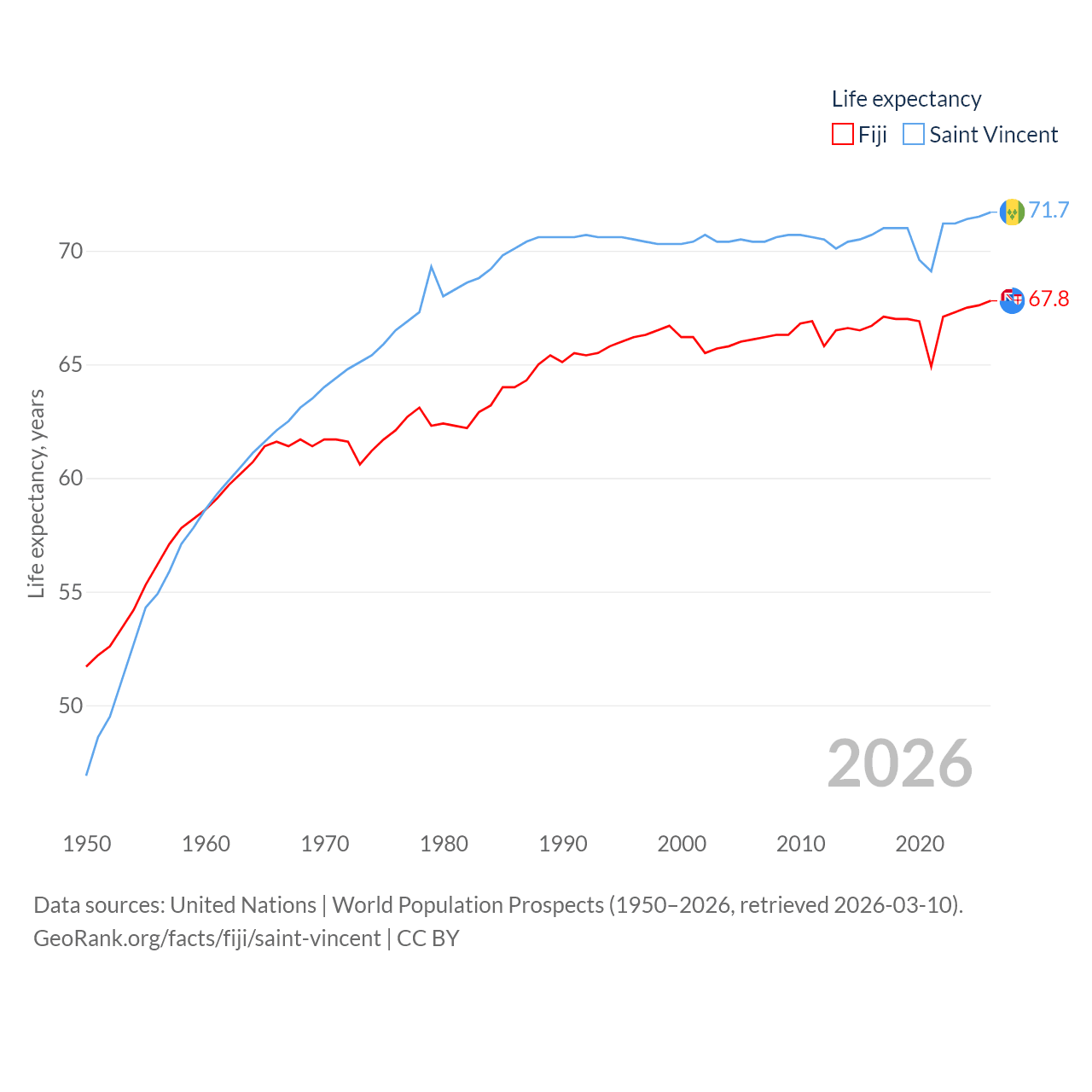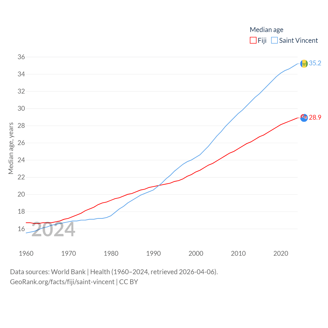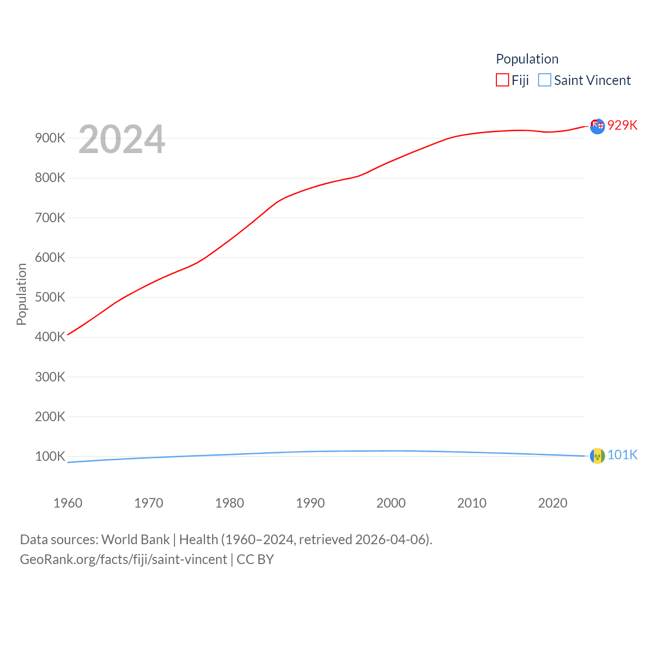 Fiji has a population of 929K (ranked 159/197), compared with 101K in Saint Vincent (ranked 184/197). Fiji's land area is 7,054 sq mi versus 150.6 sq mi for Saint Vincent (ranked 152nd vs. 185th).