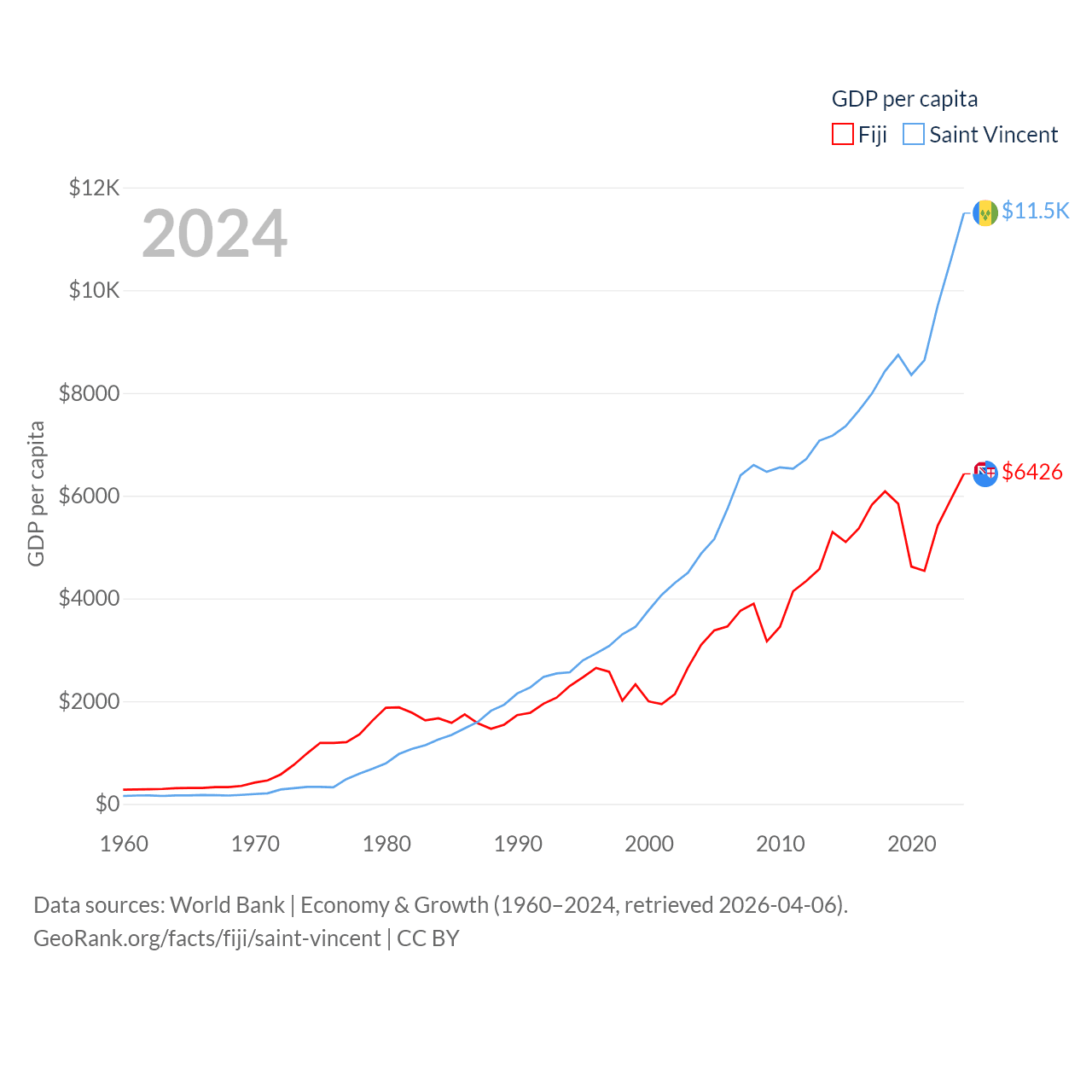 By GDP, Fiji ranks 161/197 ($5.97B) and Saint Vincent ranks 186/197 ($1.16B). By GDP per capita, Fiji ranks 108/197 ($6,426), while Saint Vincent ranks 81/197 ($11,501).