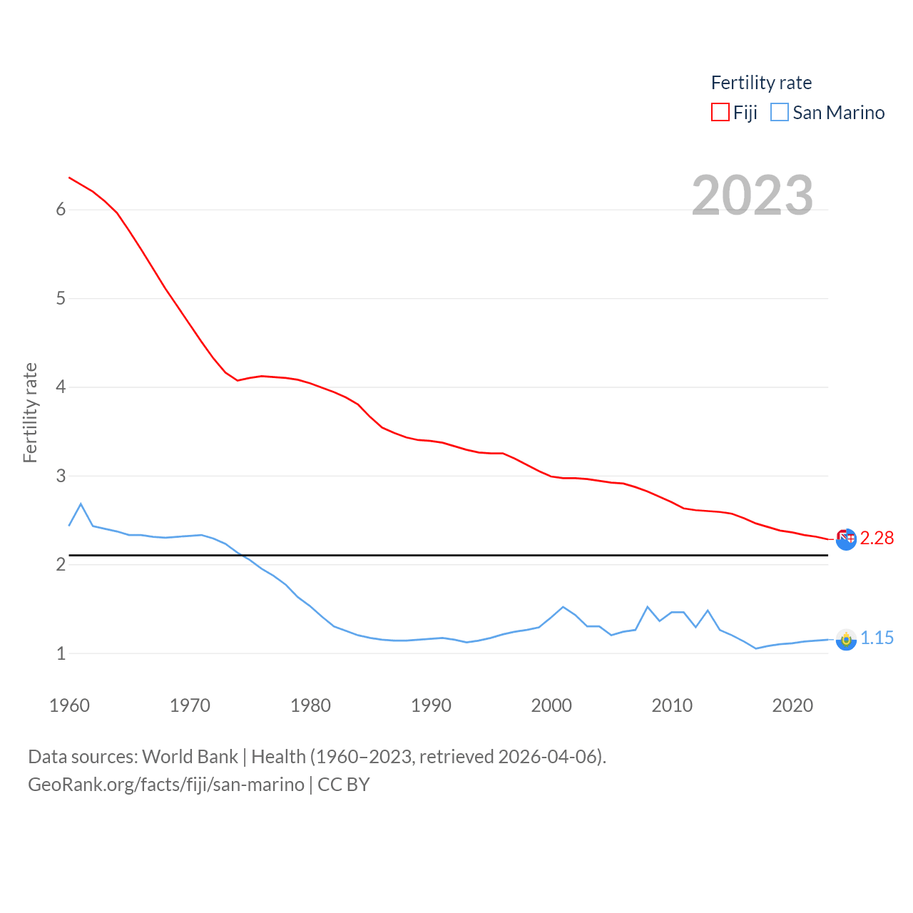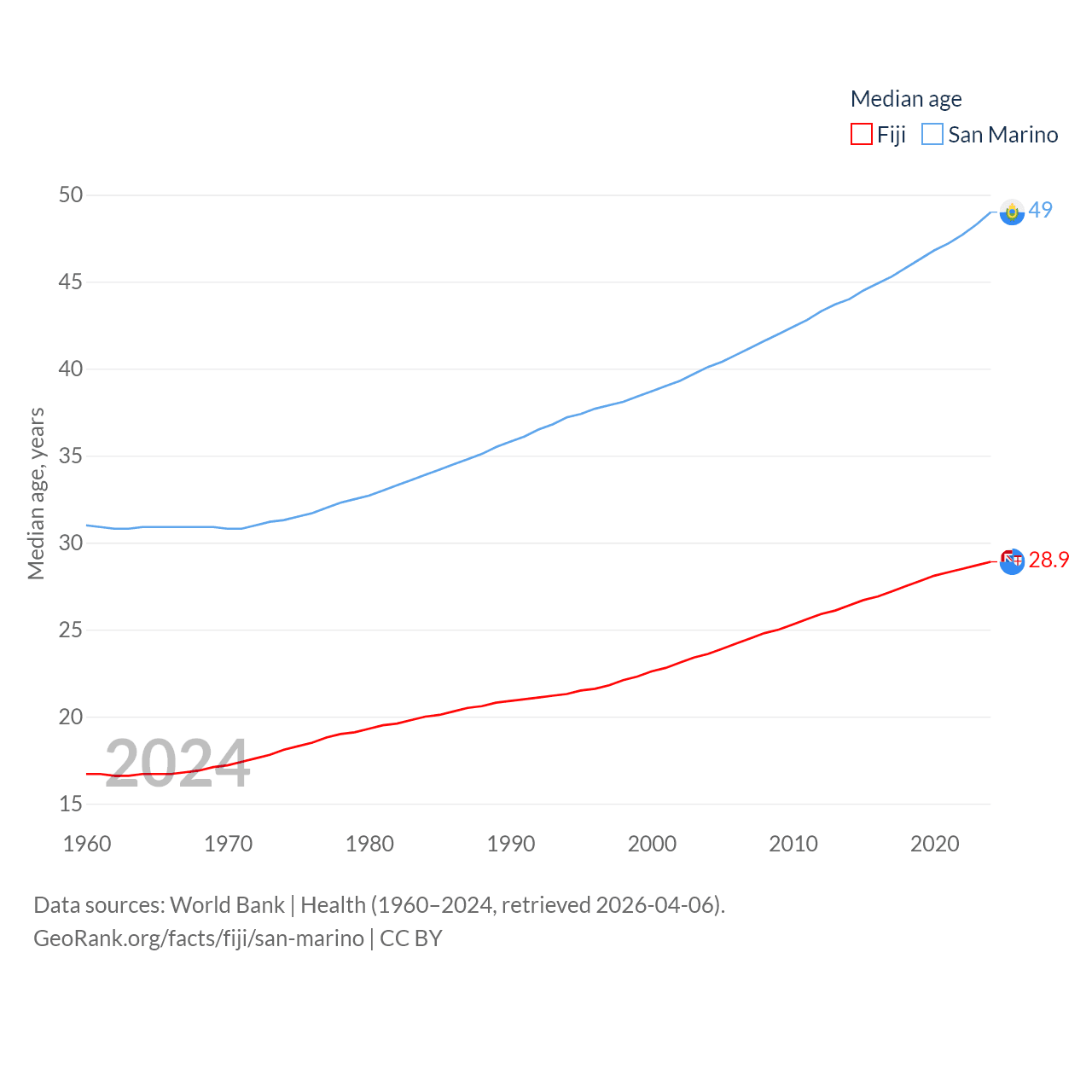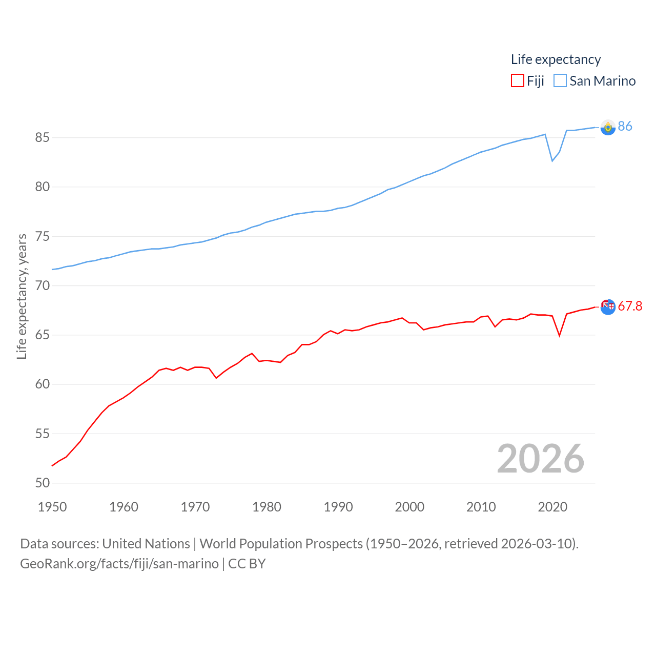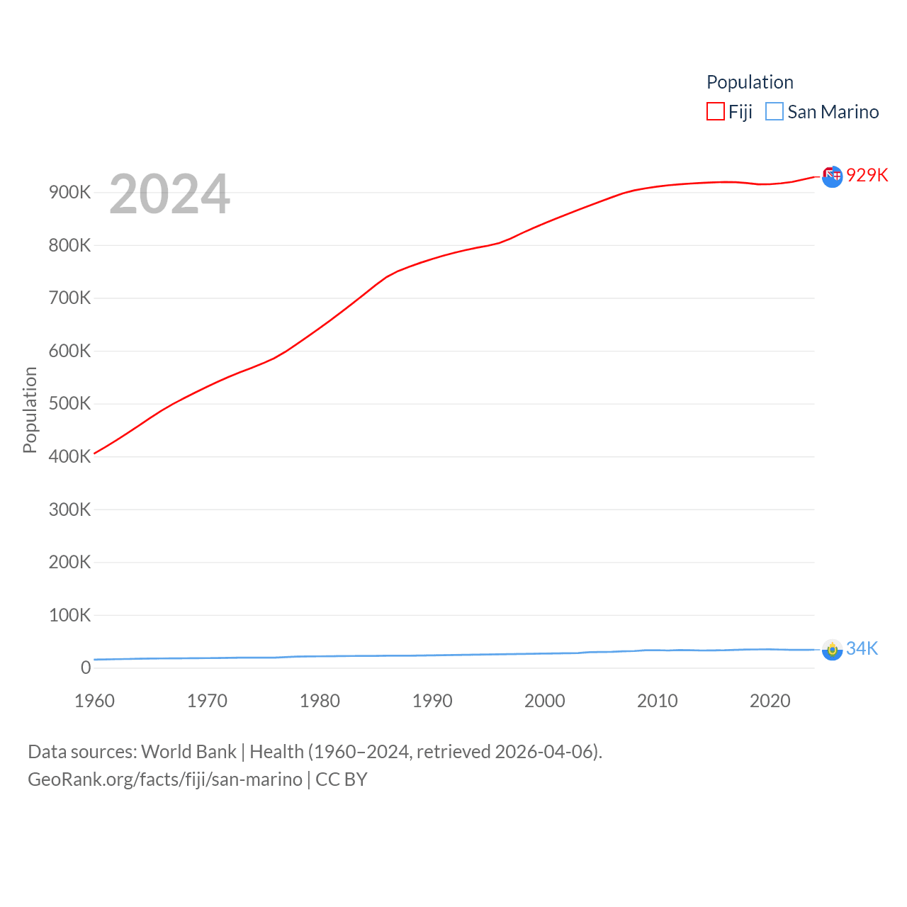 Fiji has a population of 929K (ranked 159/197), compared with 34K in San Marino (ranked 193/197). Fiji's land area is 7,054 sq mi versus 23.2 sq mi for San Marino (ranked 152nd vs. 193rd).