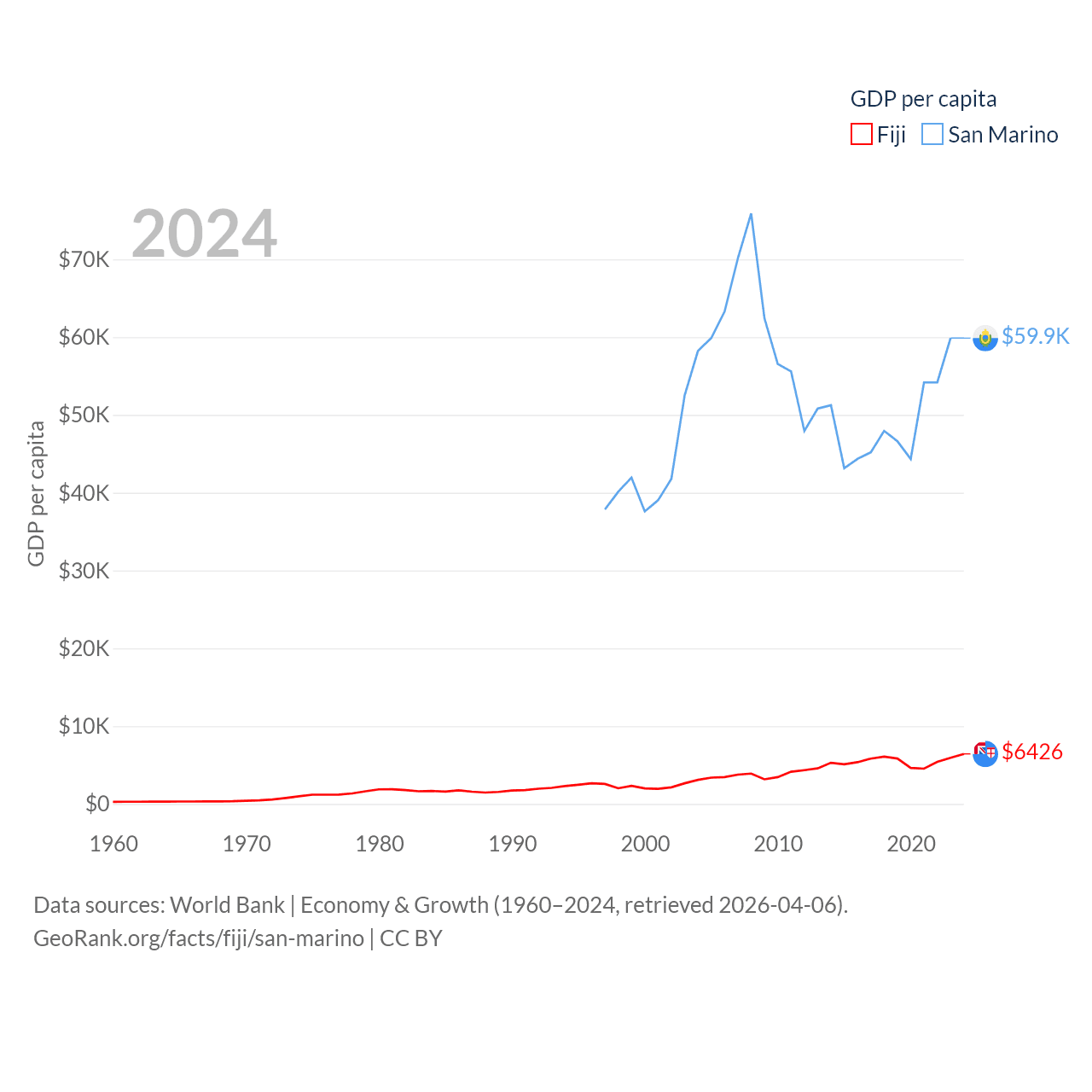 By GDP, Fiji ranks 161/197 ($5.97B) and San Marino ranks 180/197 ($2.03B). By GDP per capita, Fiji ranks 108/197 ($6,426), while San Marino ranks 15/197 ($59,880).