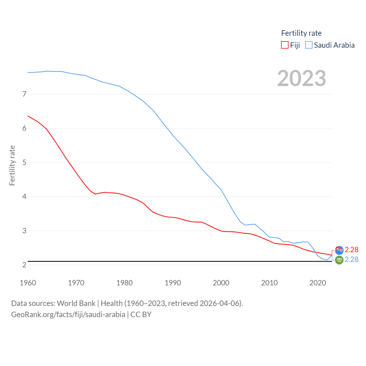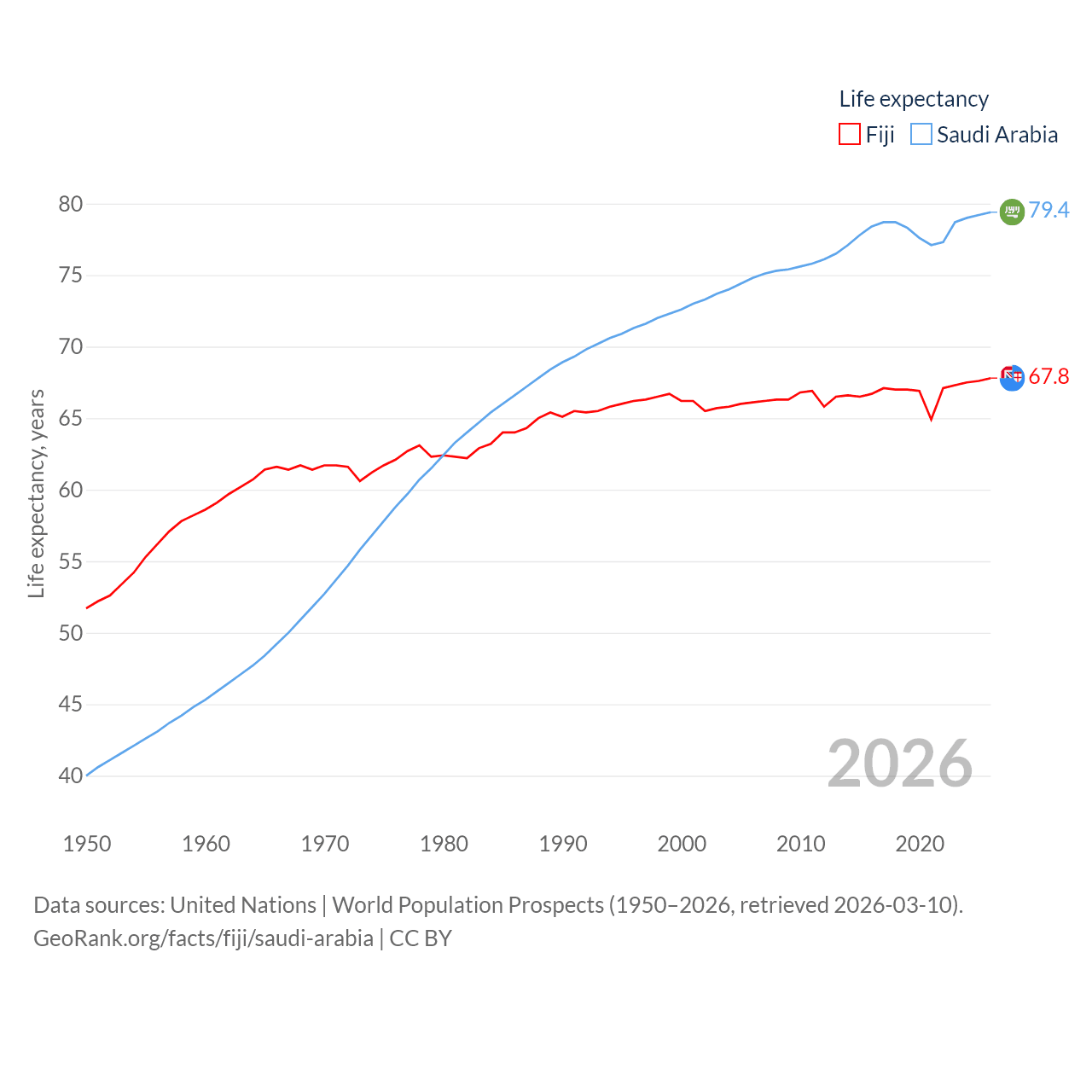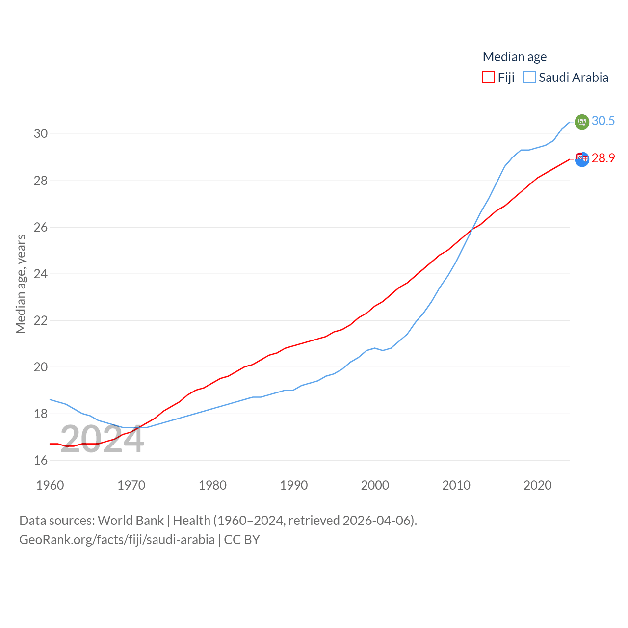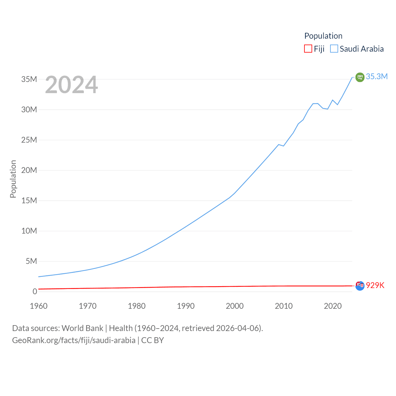 Fiji has a population of 929K (ranked 159/197), compared with 35.3M in Saudi Arabia (ranked 45/197). Fiji's land area is 7,054 sq mi versus 830,000 sq mi for Saudi Arabia (ranked 152nd vs. 12th).