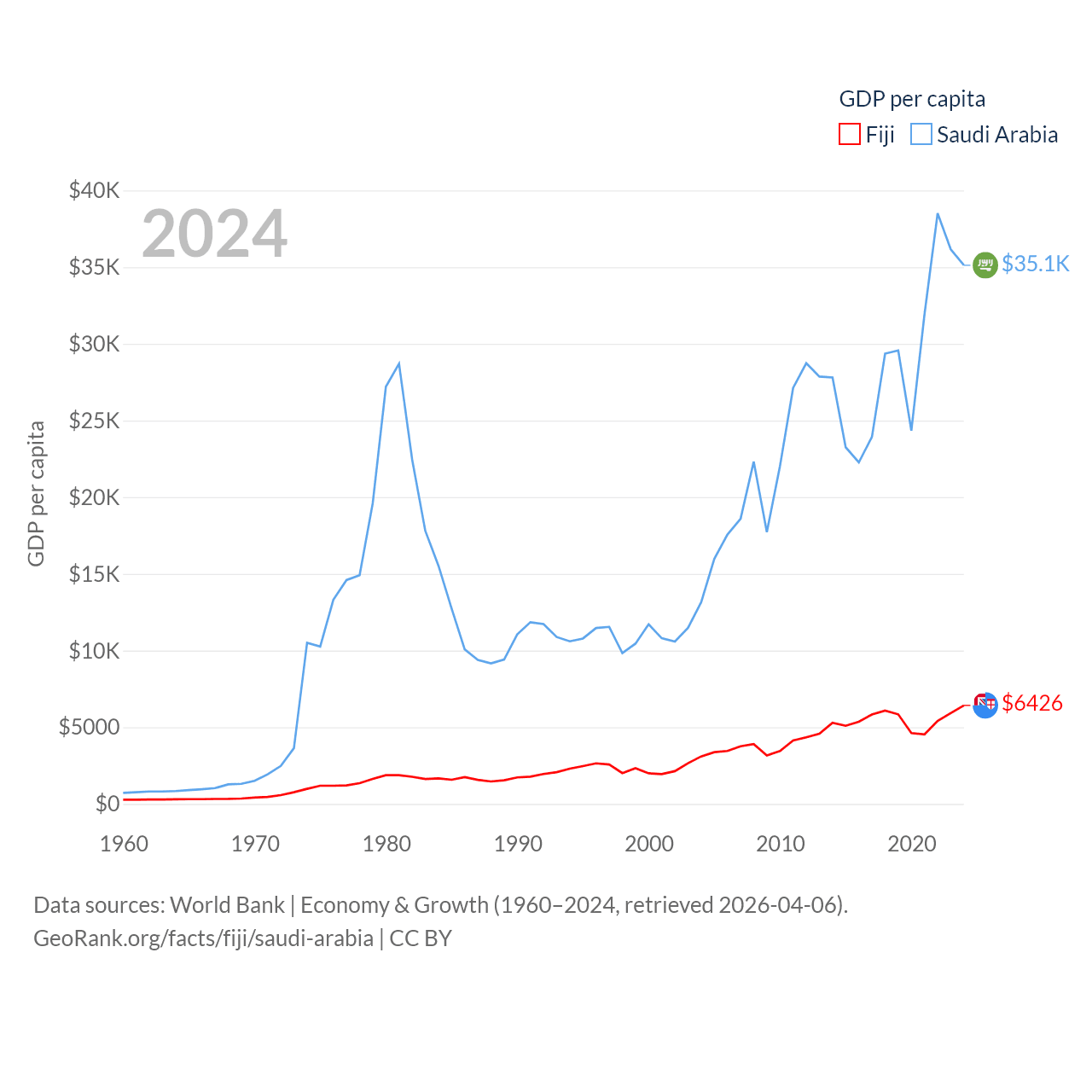 By GDP, Fiji ranks 161/197 ($5.97B) and Saudi Arabia ranks 18/197 ($1.24T). By GDP per capita, Fiji ranks 108/197 ($6,426), while Saudi Arabia ranks 33/197 ($35,122).