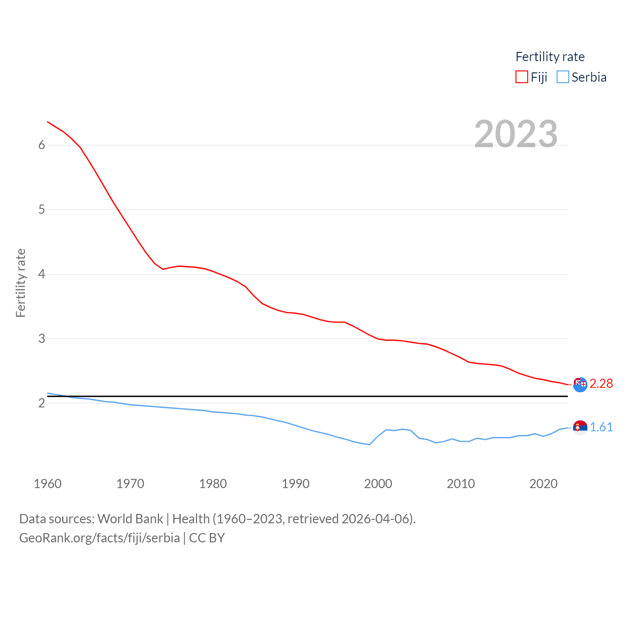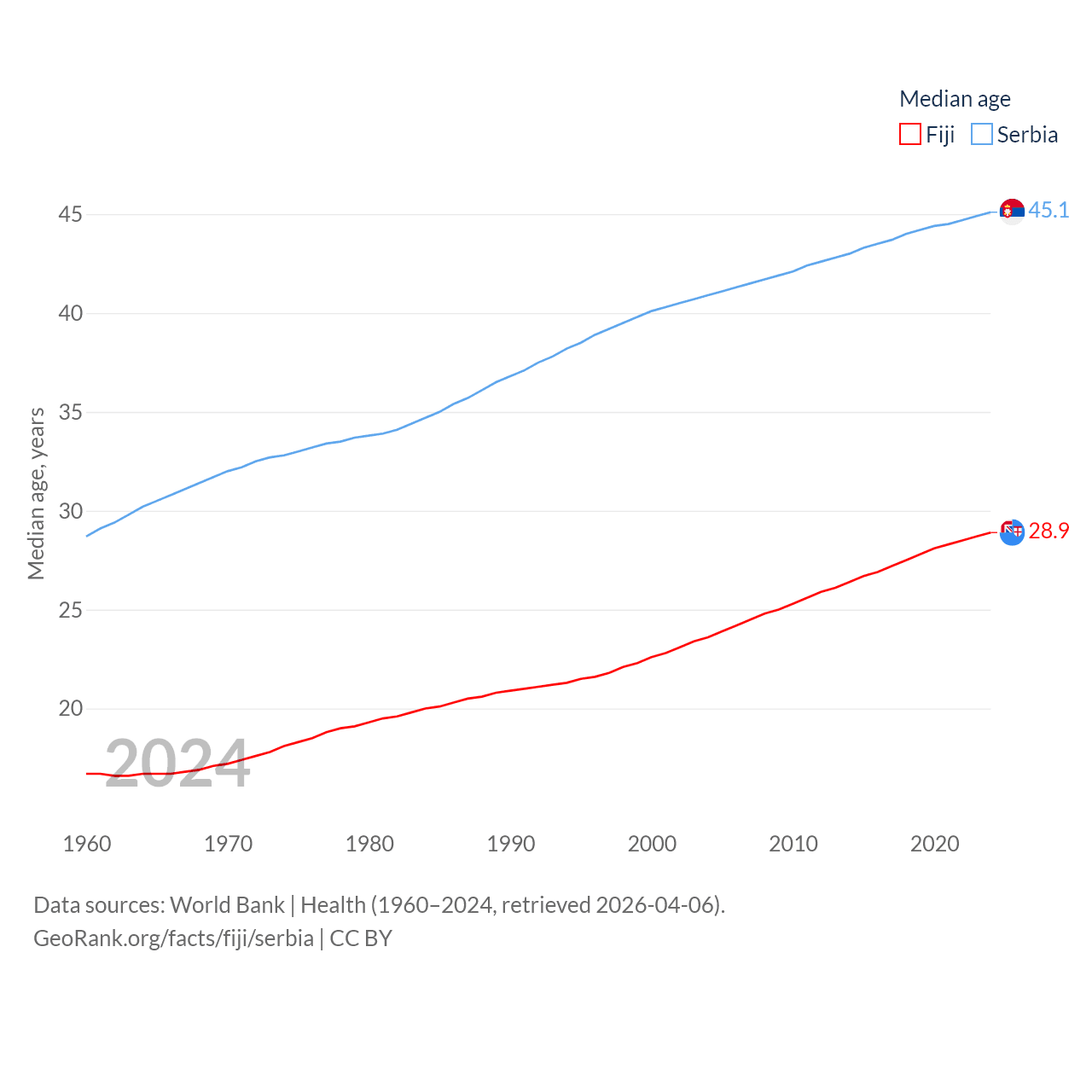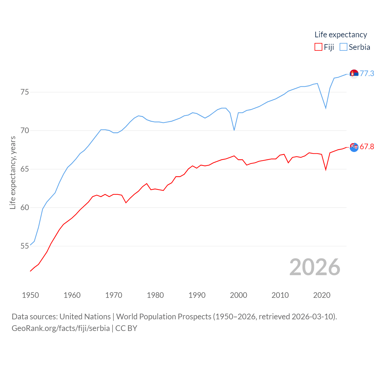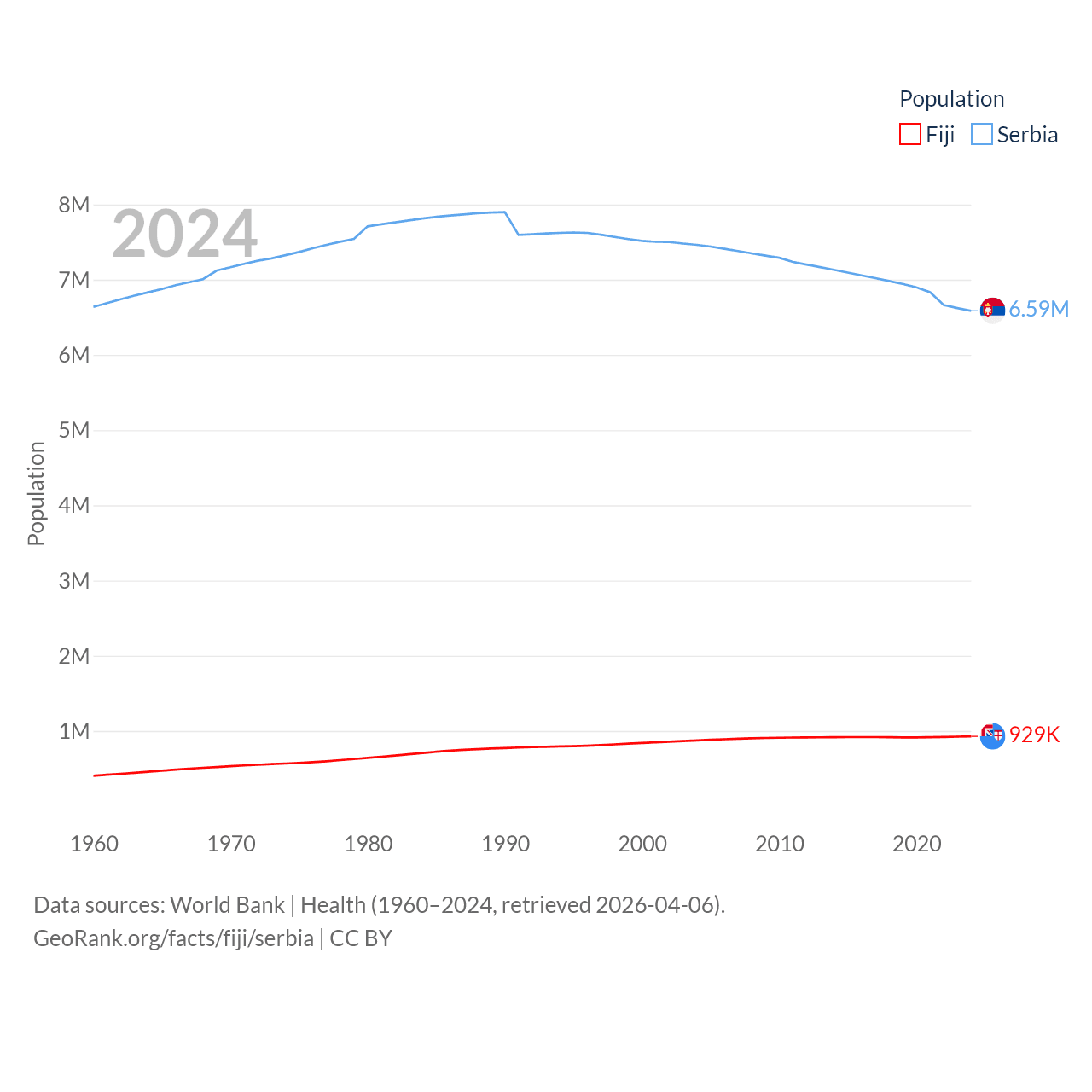 Fiji has a population of 929K (ranked 159/197), compared with 6.59M in Serbia (ranked 109/197). Fiji's land area is 7,054 sq mi versus 32,467 sq mi for Serbia (ranked 152nd vs. 111th).
