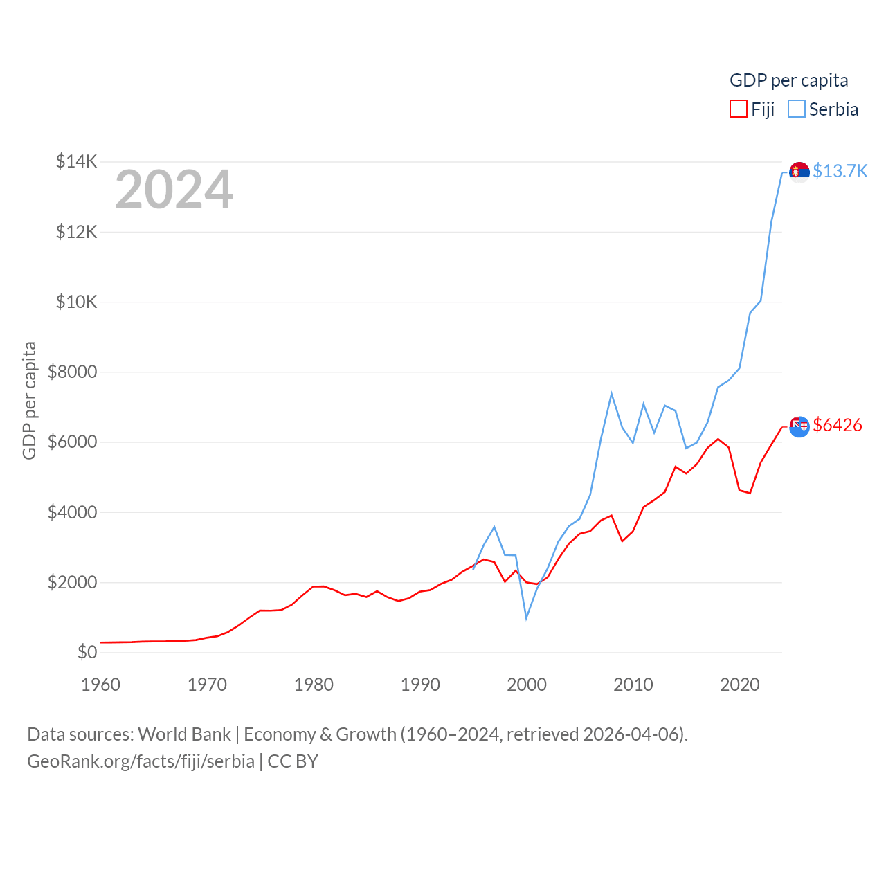 By GDP, Fiji ranks 161/197 ($5.97B) and Serbia ranks 76/197 ($90.1B). By GDP per capita, Fiji ranks 108/197 ($6,426), while Serbia ranks 73/197 ($13,679).