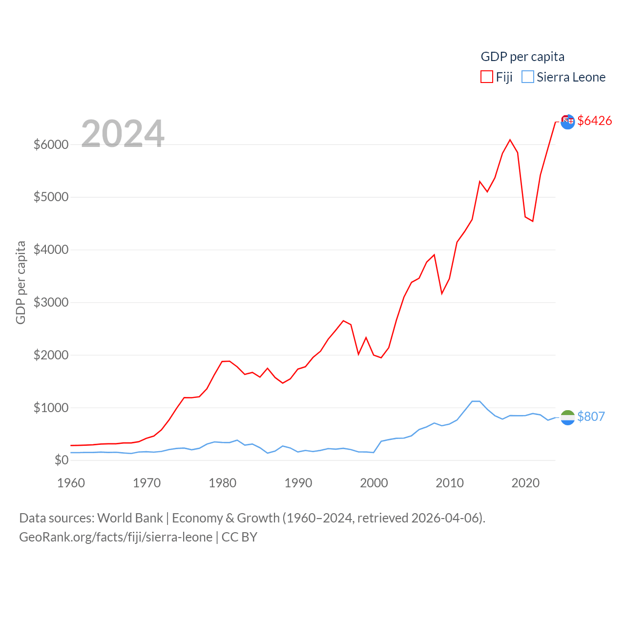 By GDP, Fiji ranks 161/197 ($5.97B) and Sierra Leone ranks 160/197 ($6.97B). By GDP per capita, Fiji ranks 108/197 ($6,426), while Sierra Leone ranks 186/197 ($807).
