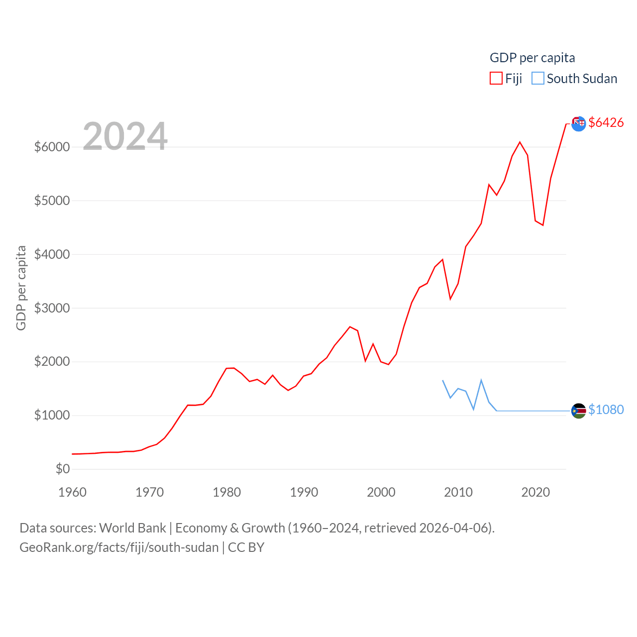 By GDP, Fiji ranks 161/197 ($5.97B) and South Sudan ranks 149/197 ($12B). By GDP per capita, Fiji ranks 108/197 ($6,426), while South Sudan ranks 175/197 ($1,080).