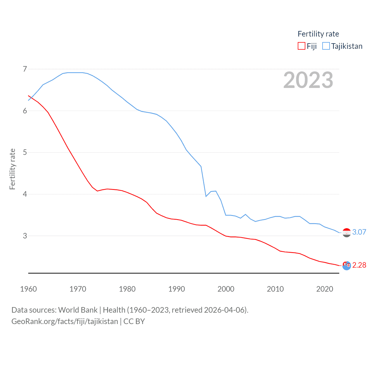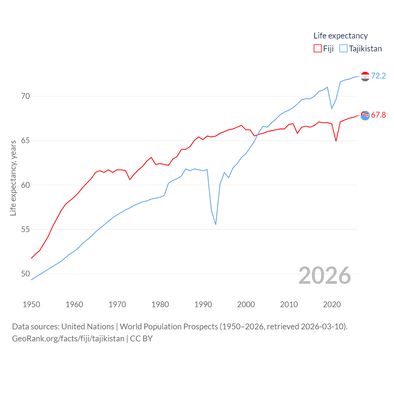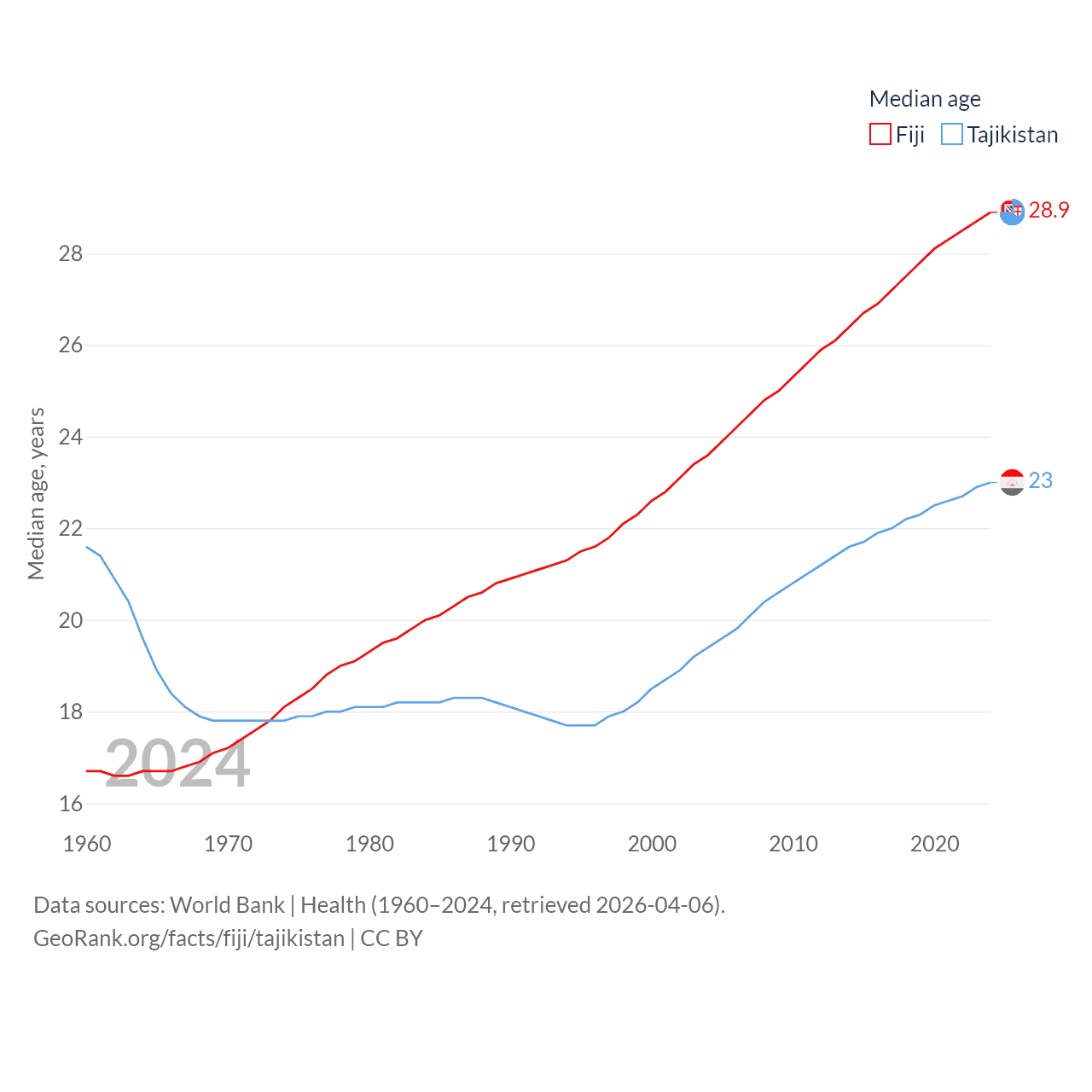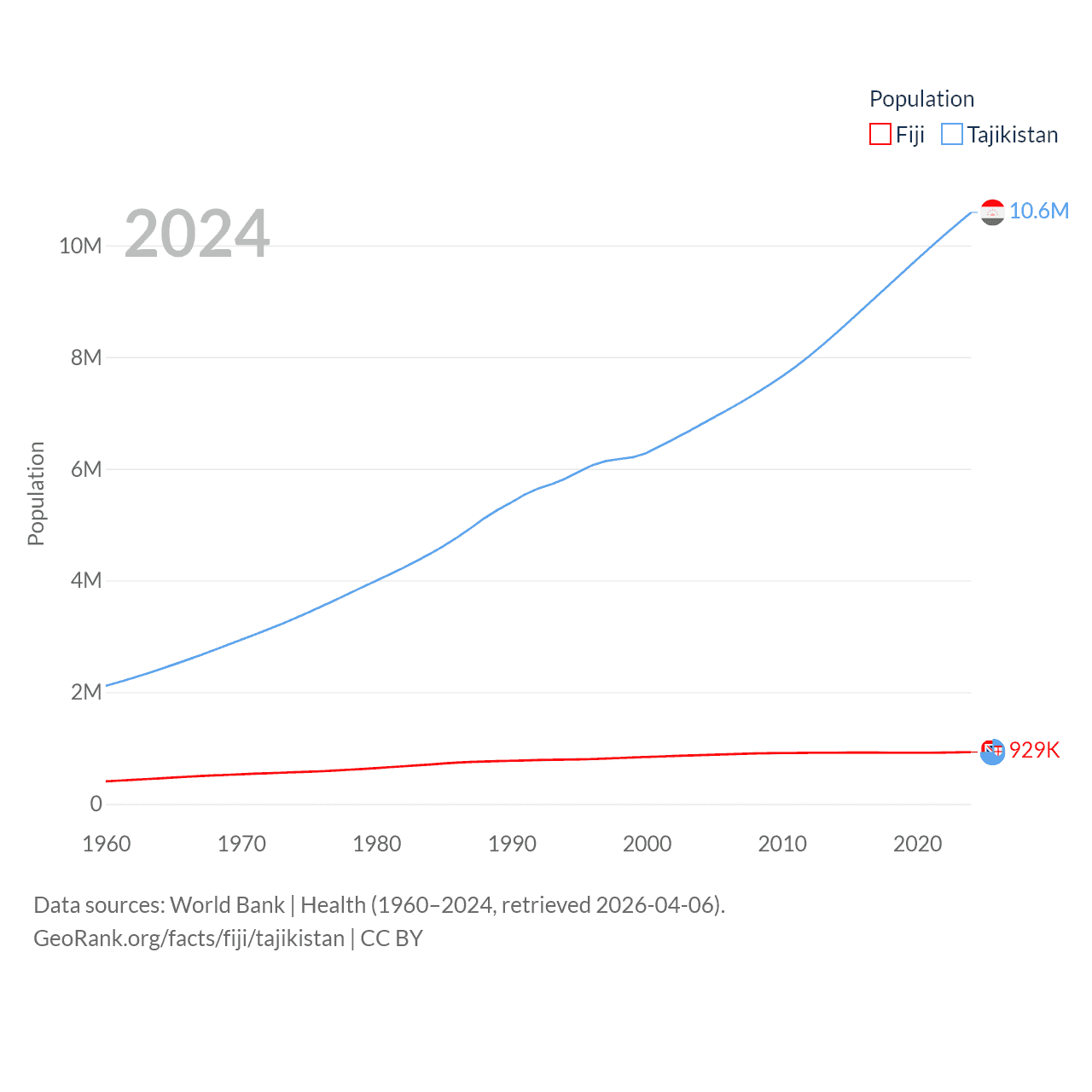 Fiji has a population of 929K (ranked 159/197), compared with 10.6M in Tajikistan (ranked 91/197). Fiji's land area is 7,054 sq mi versus 53,587 sq mi for Tajikistan (ranked 152nd vs. 93rd).