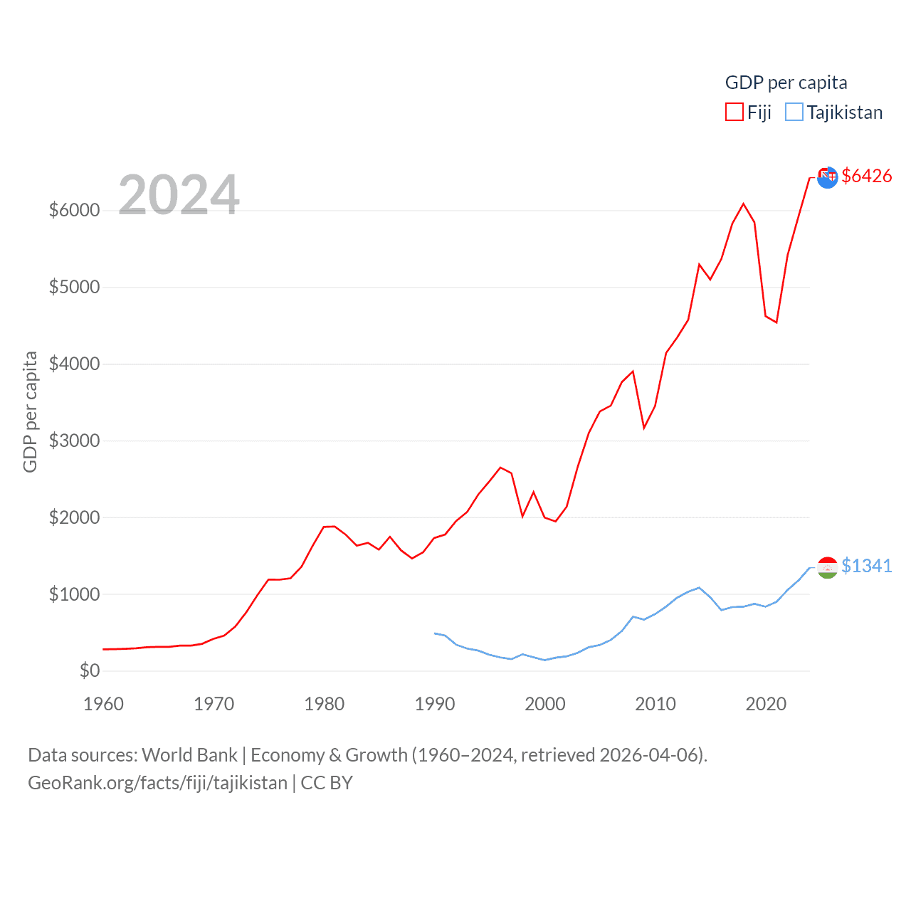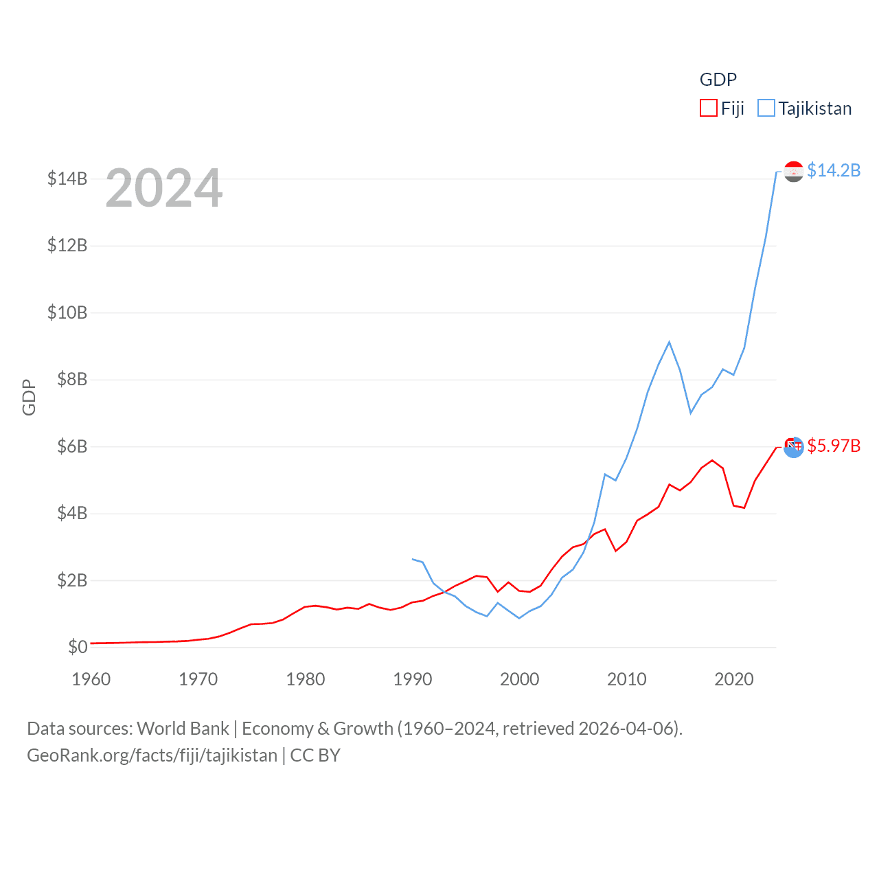 By GDP, Fiji ranks 161/197 ($5.97B) and Tajikistan ranks 145/197 ($14.2B). By GDP per capita, Fiji ranks 108/197 ($6,426), while Tajikistan ranks 166/197 ($1,341).