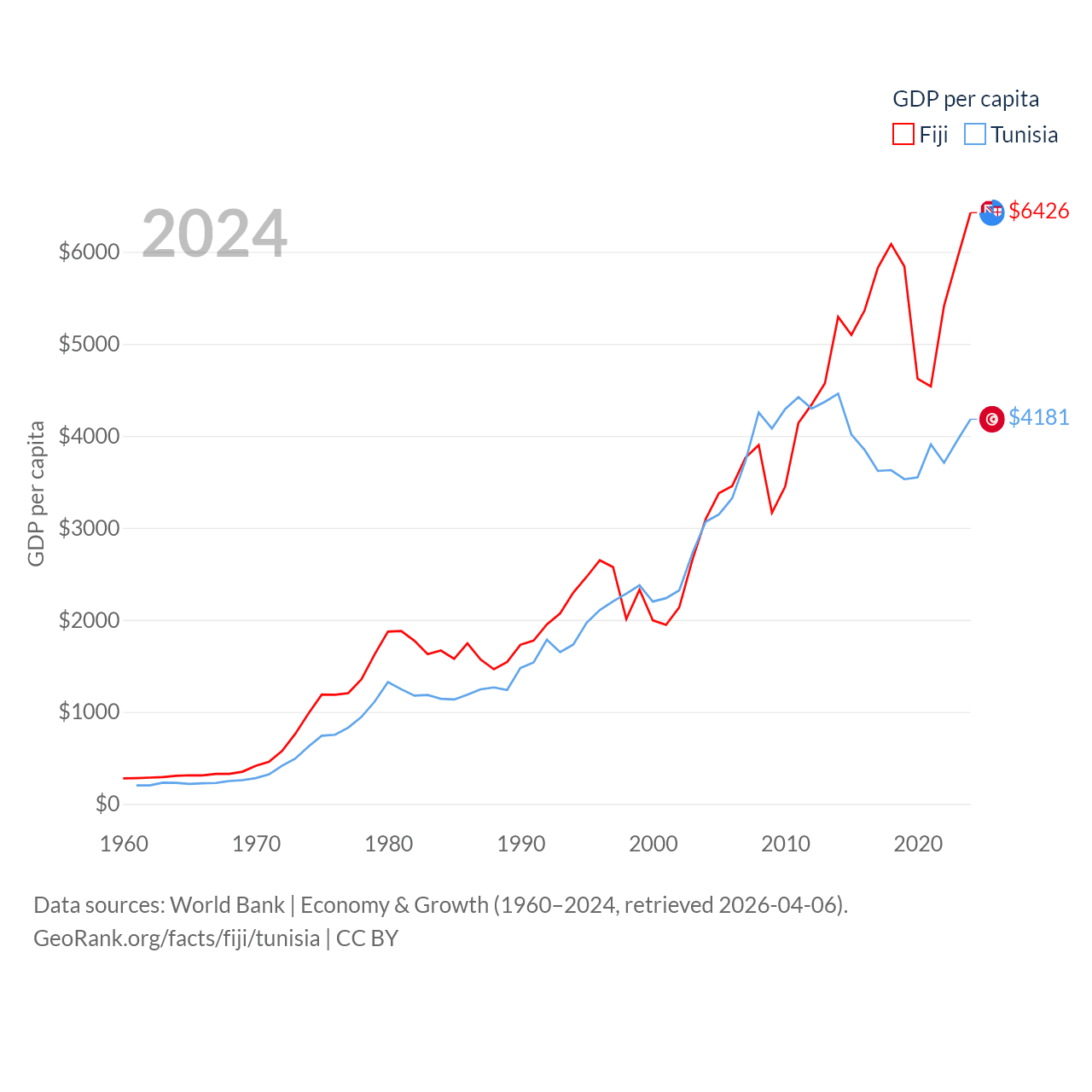 By GDP, Fiji ranks 161/197 ($5.97B) and Tunisia ranks 93/197 ($51.3B). By GDP per capita, Fiji ranks 108/197 ($6,426), while Tunisia ranks 129/197 ($4,181).