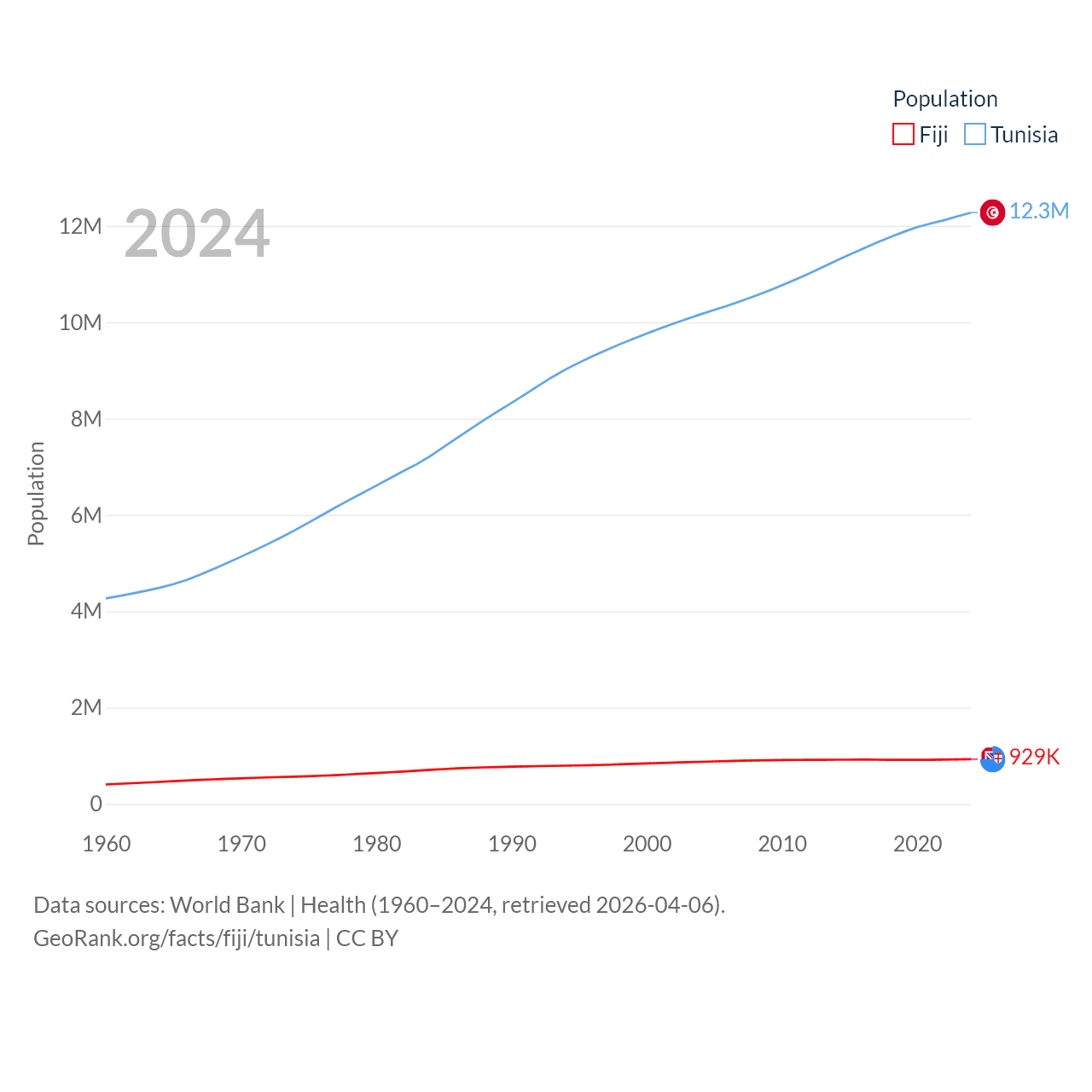 Fiji has a population of 929K (ranked 159/197), compared with 12.3M in Tunisia (ranked 80/197). Fiji's land area is 7,054 sq mi versus 59,985 sq mi for Tunisia (ranked 152nd vs. 91st).