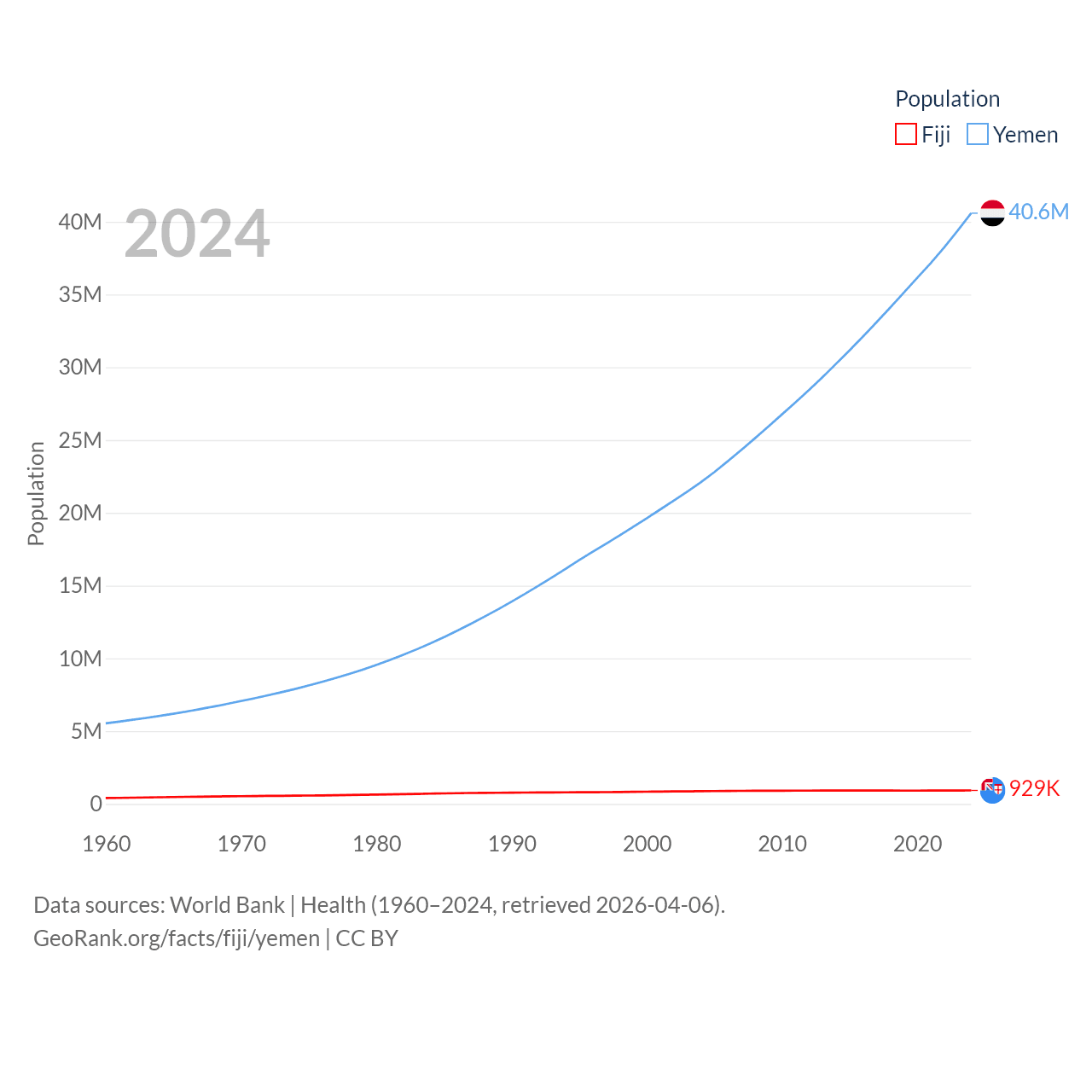 Fiji has a population of 929K (ranked 159/197), compared with 40.6M in Yemen (ranked 38/197). Fiji's land area is 7,054 sq mi versus 203,850 sq mi for Yemen (ranked 152nd vs. 49th).