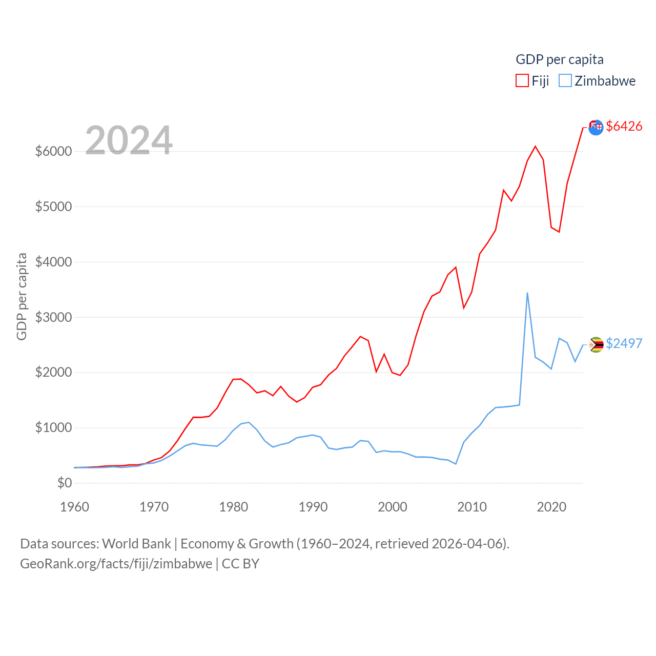 By GDP, Fiji ranks 161/197 ($5.97B) and Zimbabwe ranks 102/197 ($41.5B). By GDP per capita, Fiji ranks 108/197 ($6,426), while Zimbabwe ranks 148/197 ($2,497).
