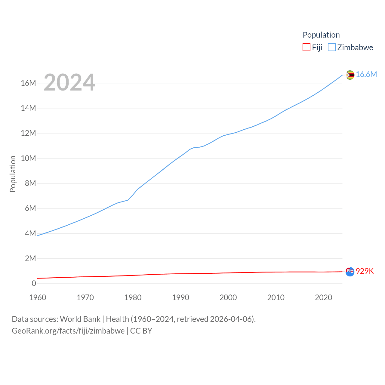 Fiji has a population of 929K (ranked 159/197), compared with 16.6M in Zimbabwe (ranked 74/197). Fiji's land area is 7,054 sq mi versus 149,364 sq mi for Zimbabwe (ranked 152nd vs. 60th).