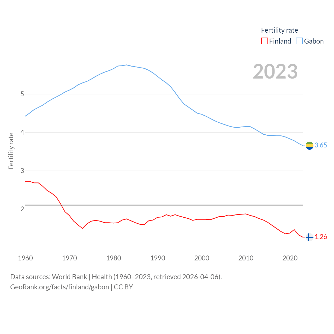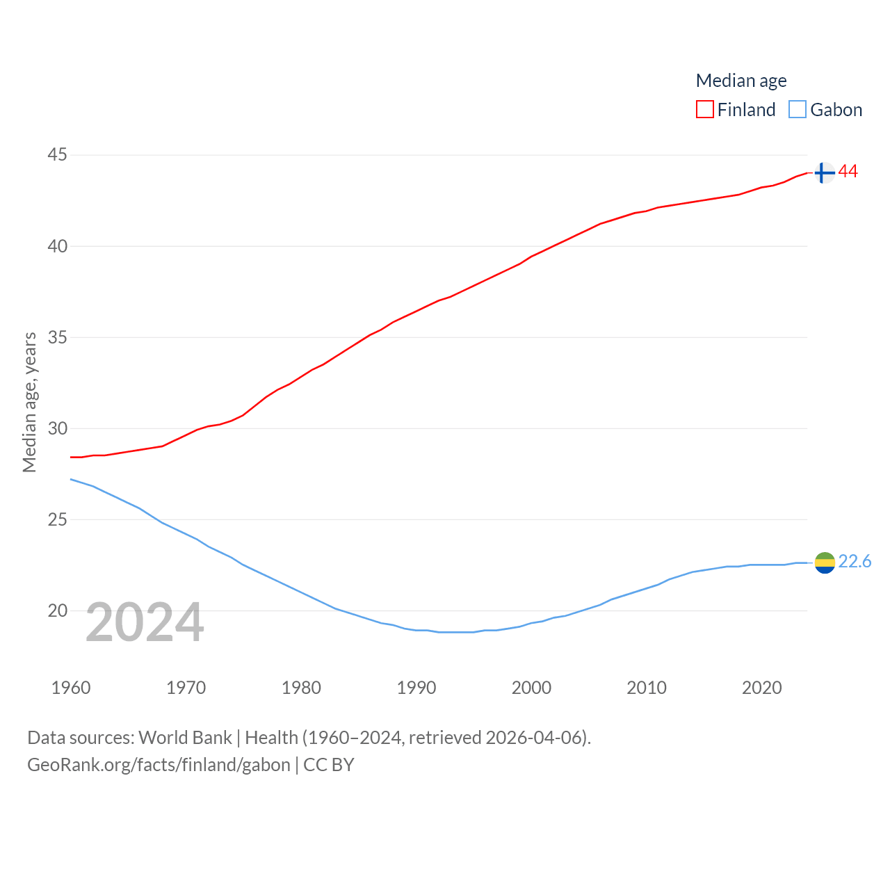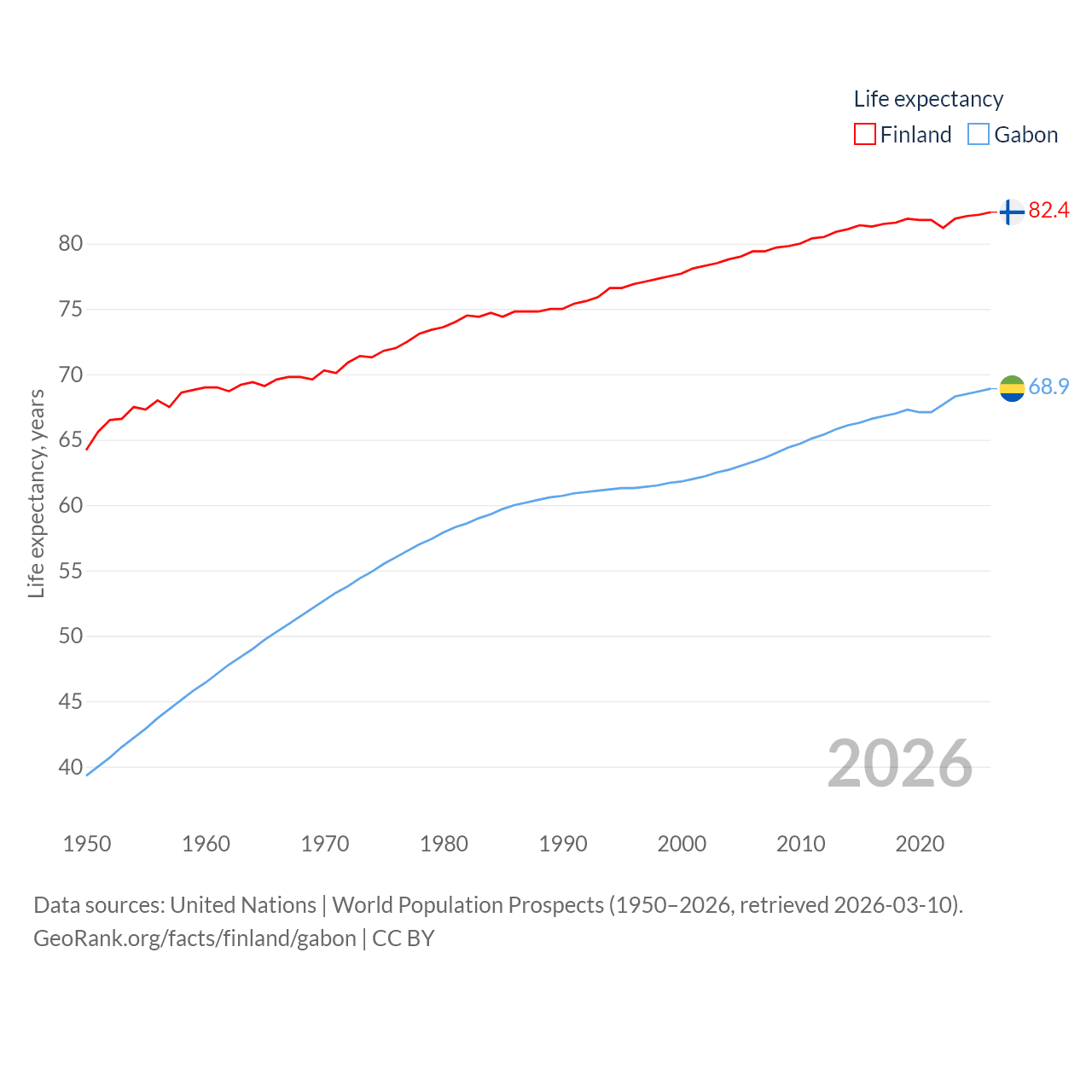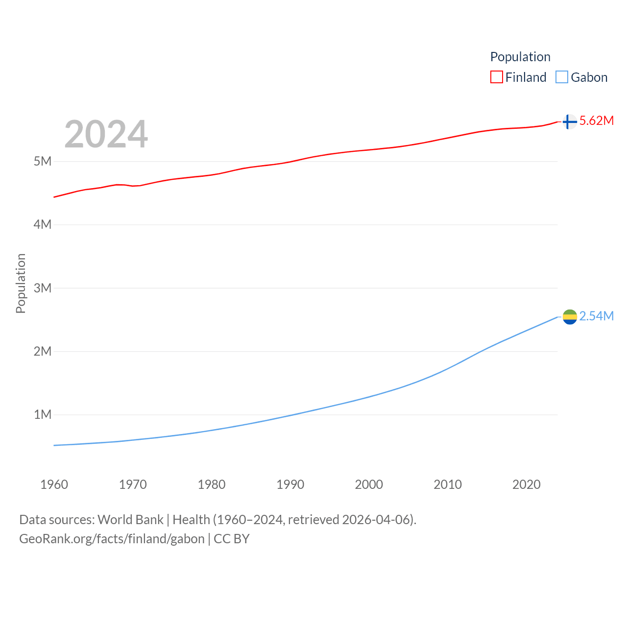 Finland has a population of 5.62M (ranked 116/197), compared with 2.54M in Gabon (ranked 141/197). Finland's land area is 117,360 sq mi versus 99,487 sq mi for Gabon (ranked 70th vs. 75th).